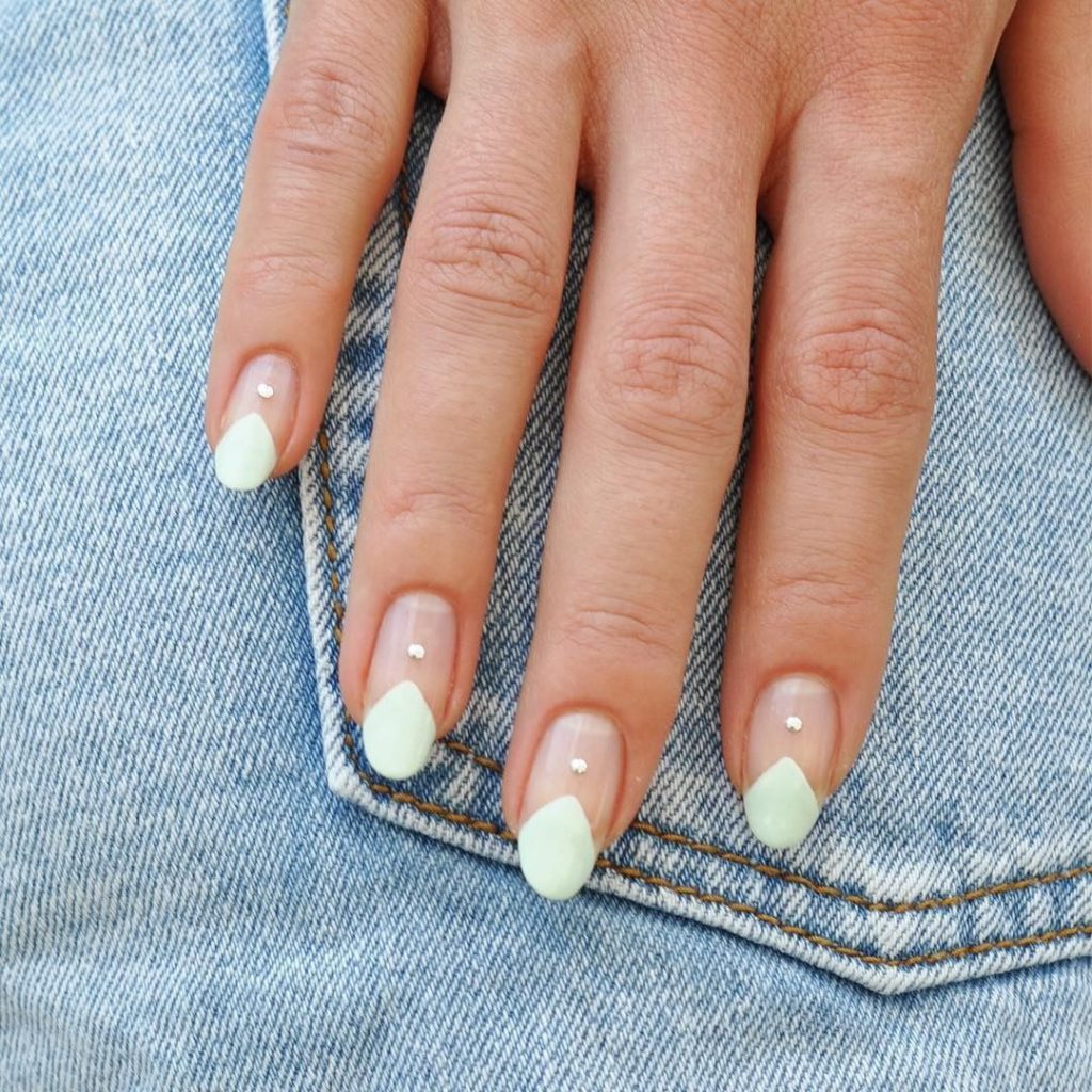 Мятный маникюр бросается в глаза, гибкий к колористике одежды. Чтобы удлинить ногти, подойдёт глянцевый топ.