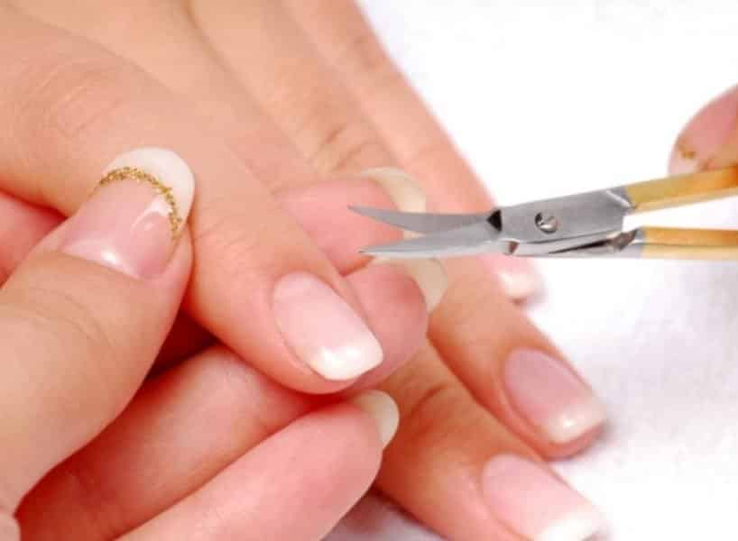 - Срежьте омертвевшую кожицу вокруг ногтей. Для этого используйте любой инструмент: щипчики или ножницы с закругленными лезвиями. Делайте срезы аккуратно: неловкое движение может повредить живой слой дермы.
