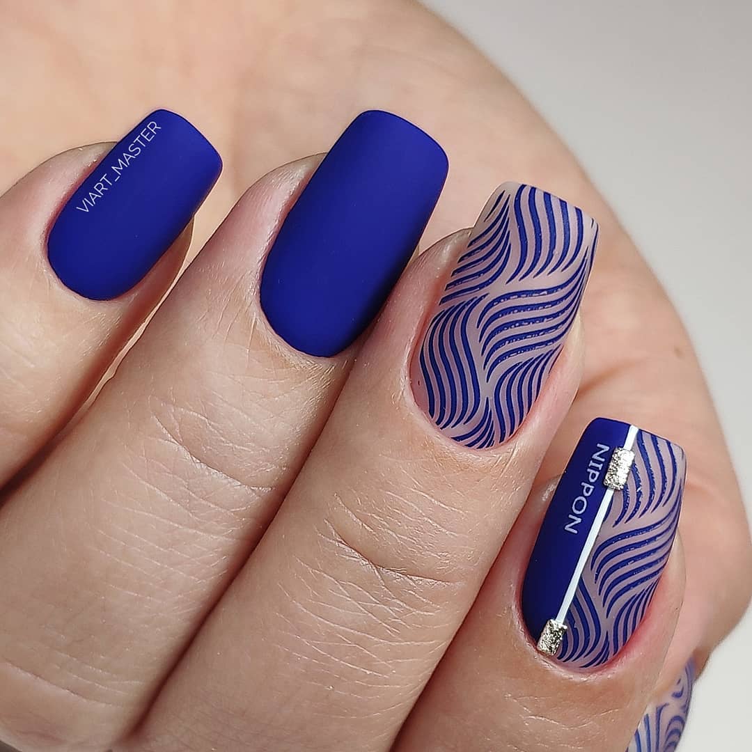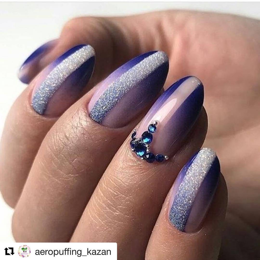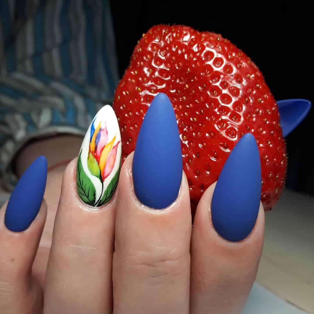 Фиолетовый. Этот цвет считается более уместным для нарощенных ногтей, нежели синий. Оригинально выглядят сливовый, сиреневый, пурпурный и оттенок индиго.