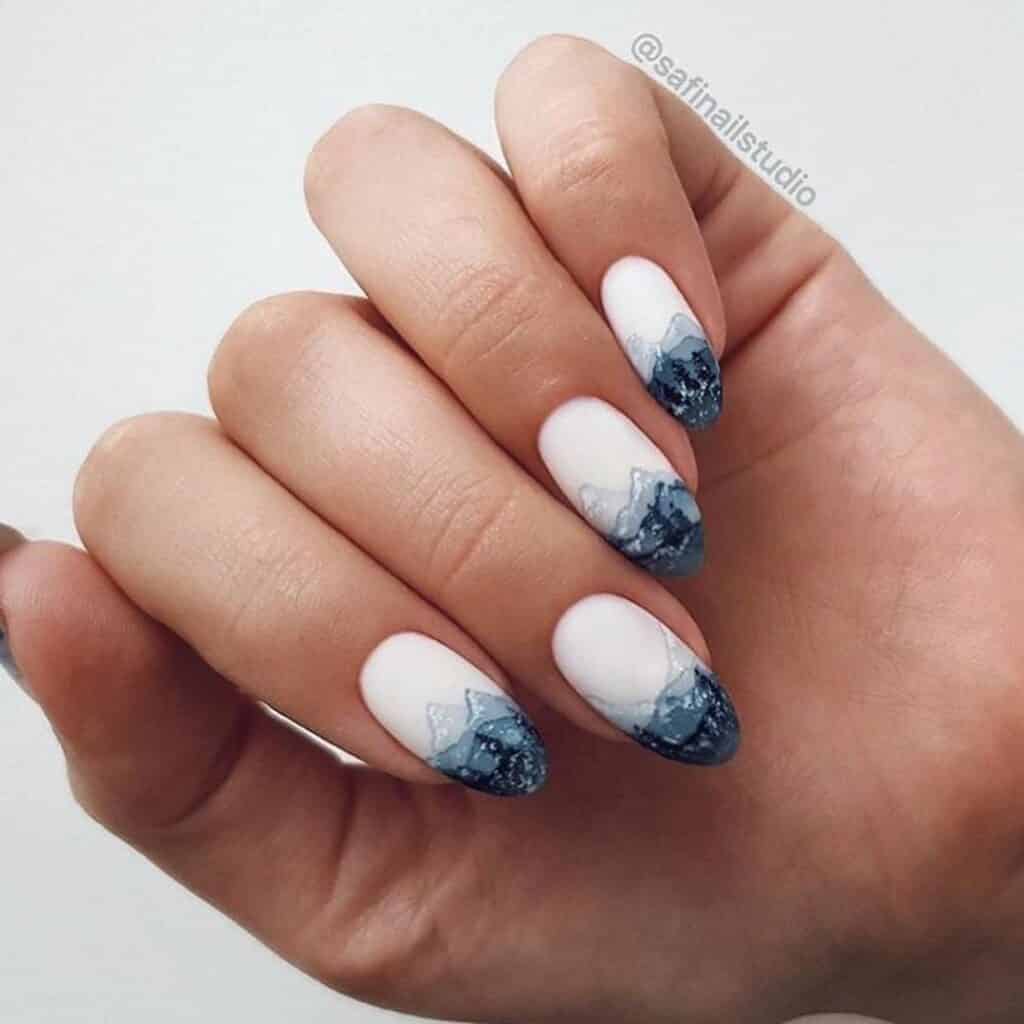 Этот же маникюр можно выполнить немного по-другому: капнуть в воду не несколько разных оттенков лаков, а один цвет, но несколько капель. Затем 2-3 раза пшикните на растёкшееся покрытие обычным лаком для волос, дальше выполняйте процедуру также, как описано в инструкции, начиная с четвертого пункта.