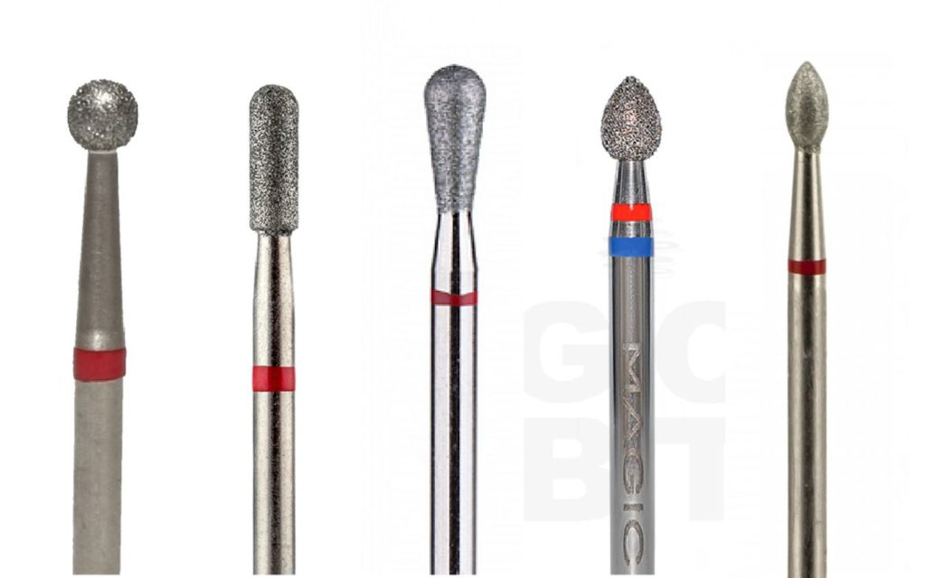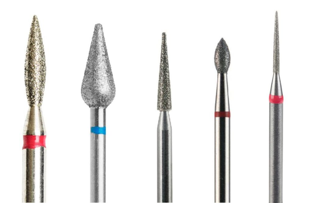 Слева направо: пламя, капля, конус, почка, фиссура (игла). Каждая форма может иметь различную длину, абразивность и диаметр.