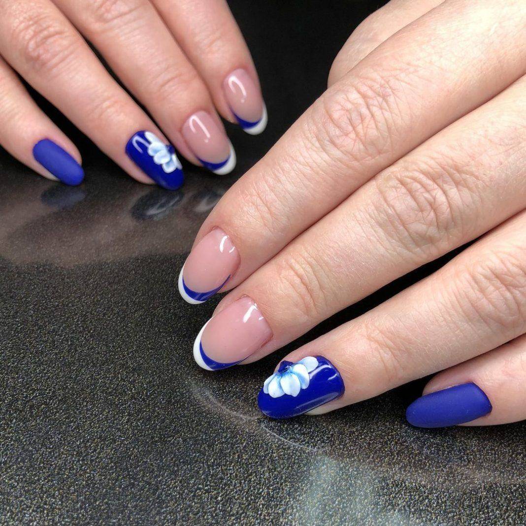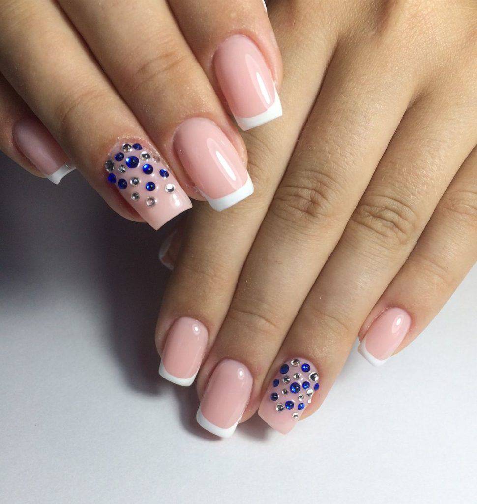 Синий френч отлично смотрится и на коротких ногтях и на длинных. Актуальный синий цвет 2020 года сочетается шикарно с камнями и блестками, идеи смотрите на фото ниже: