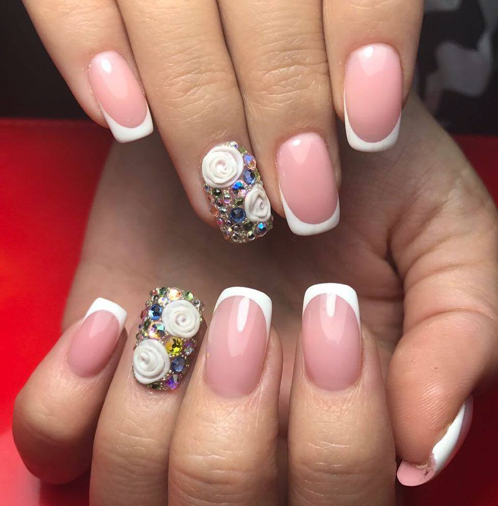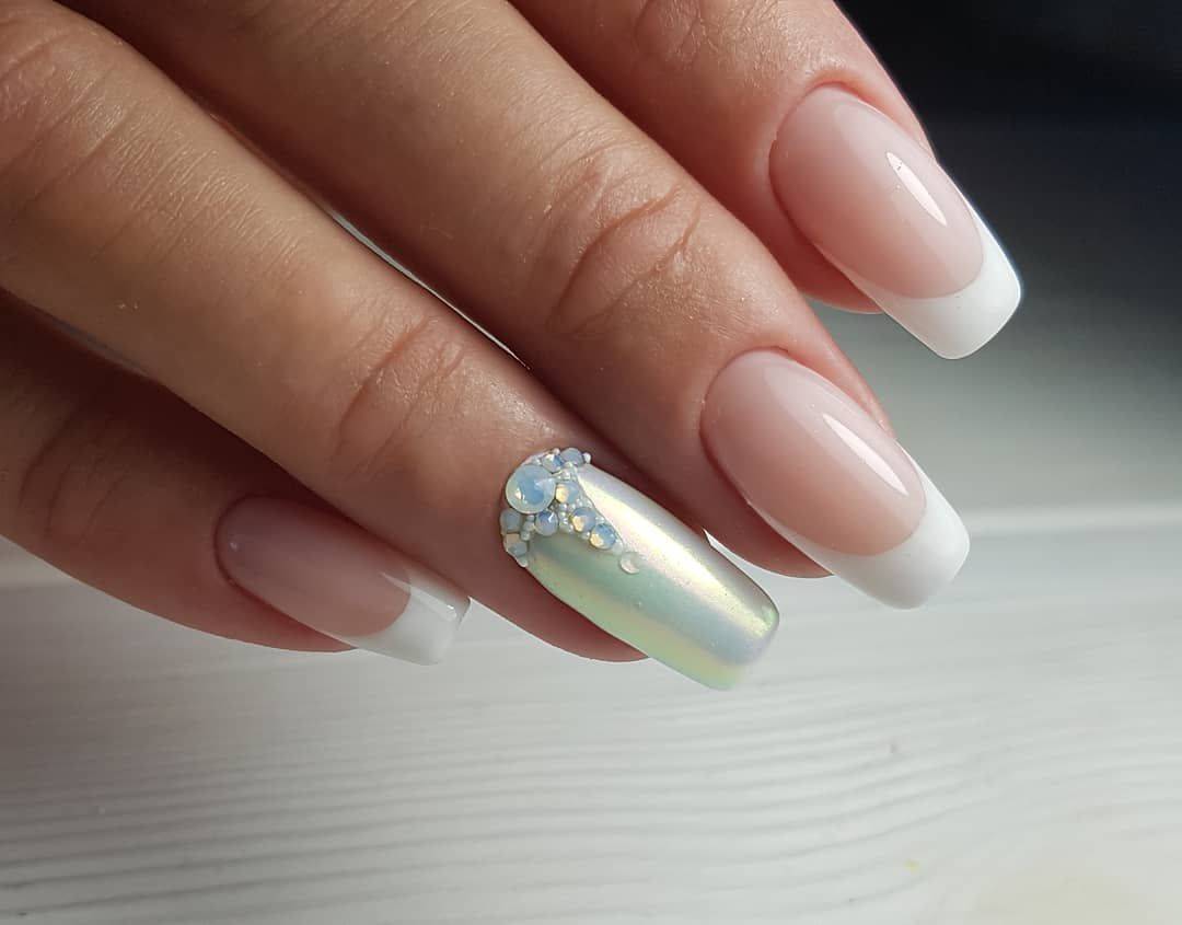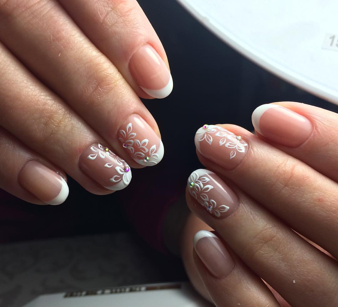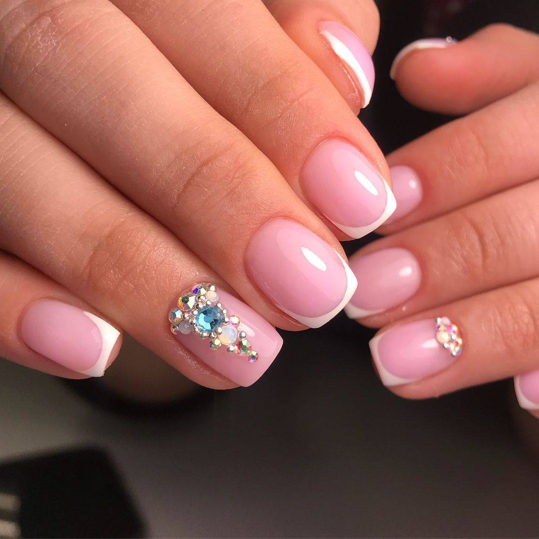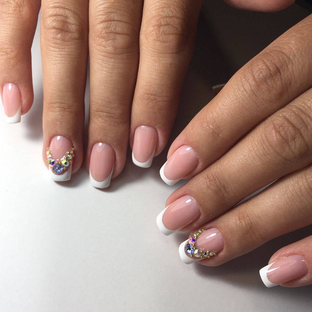В данном случае французский маникюр для этого подходит идеально. При желании его можно украсить россыпью страз или же небольшим количеством блесток.