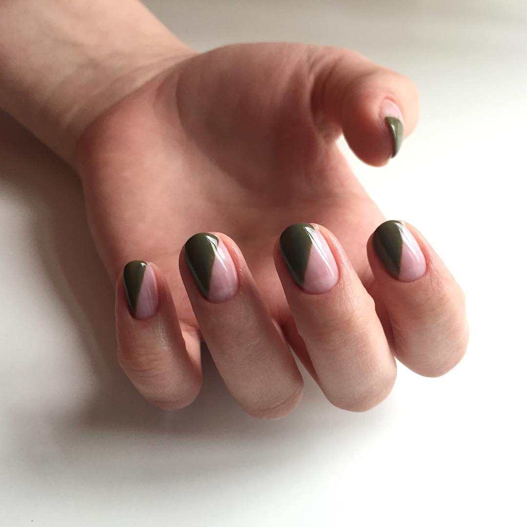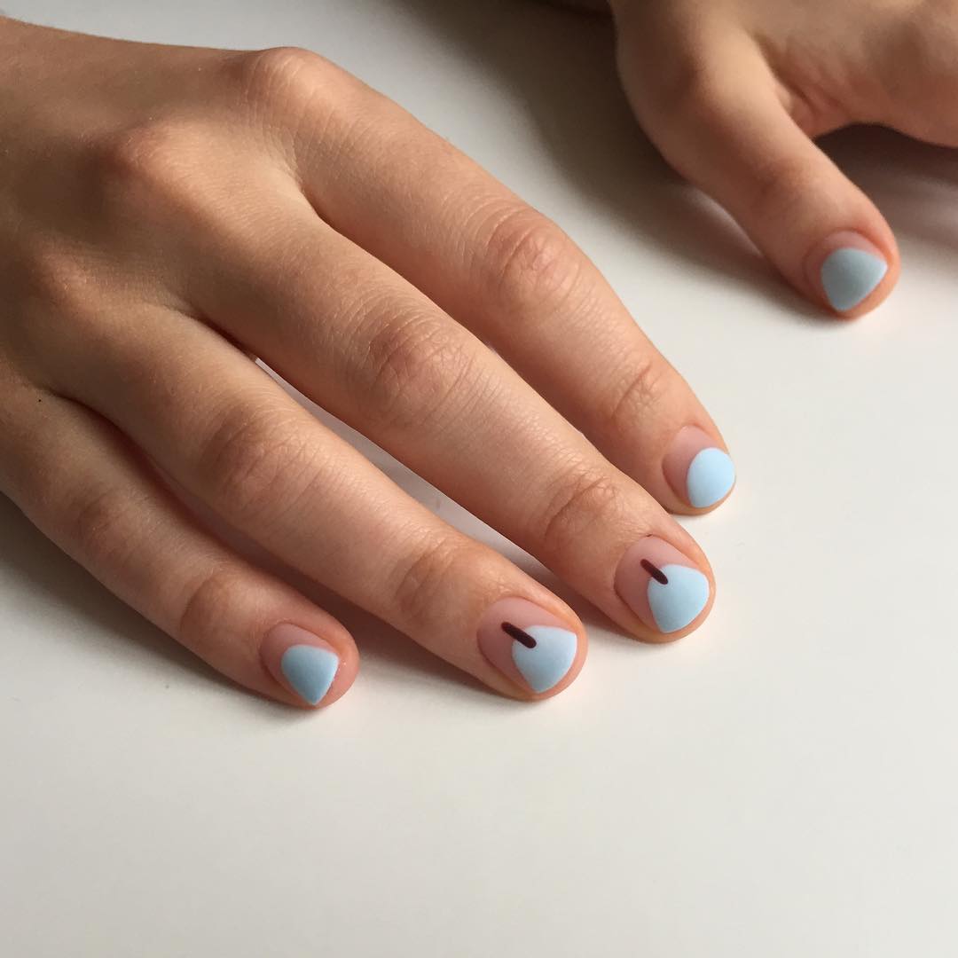 Пользуются популярностью асимметричные конфигурации. Они прекрасно смотрятся на укороченных ногтевых пластинах и даже немного визуально удлиняют их.