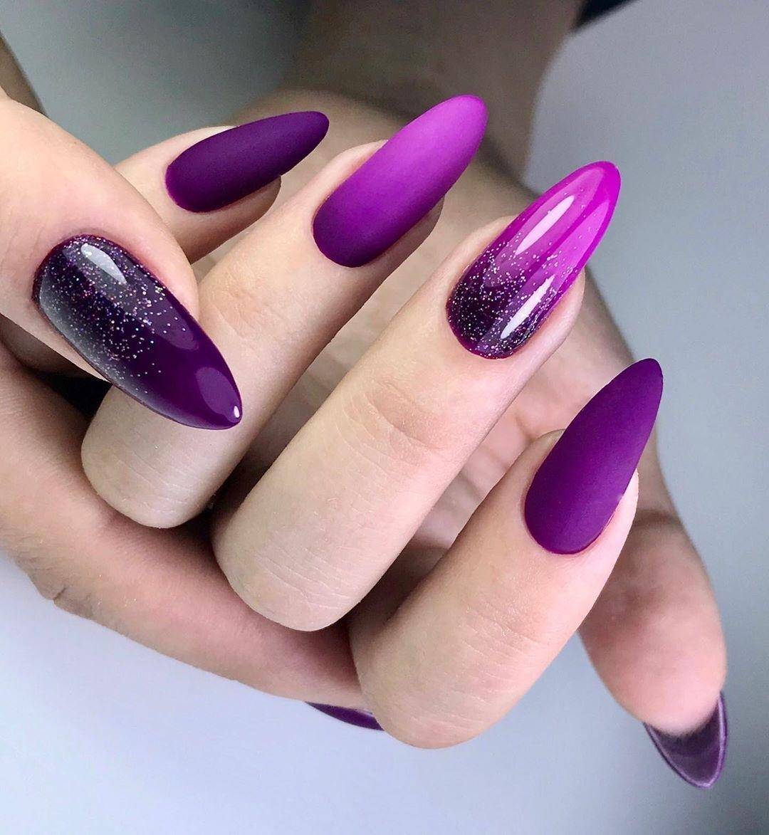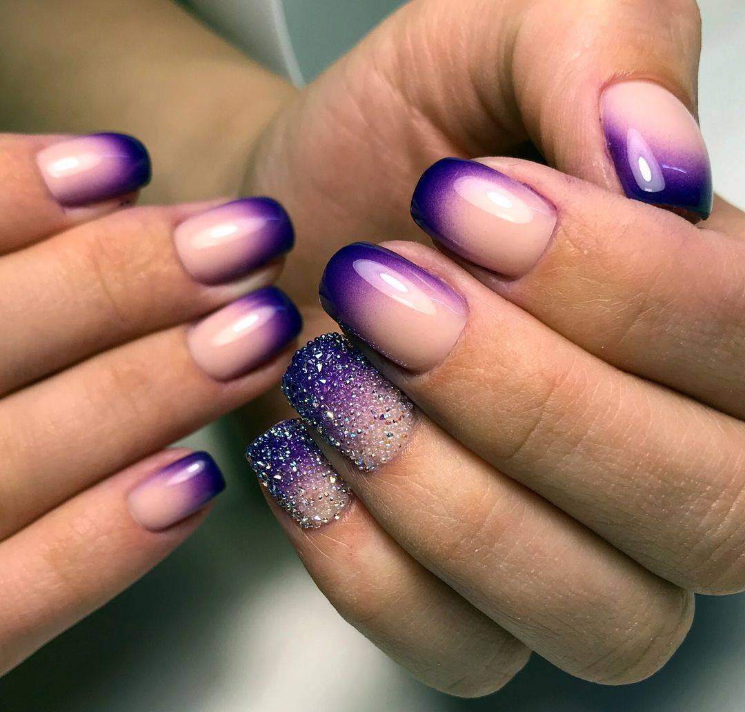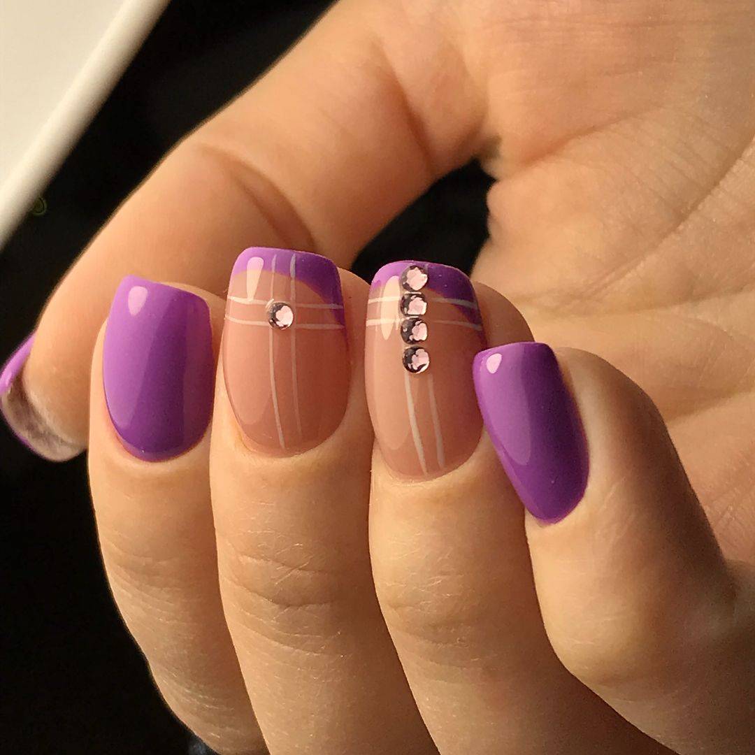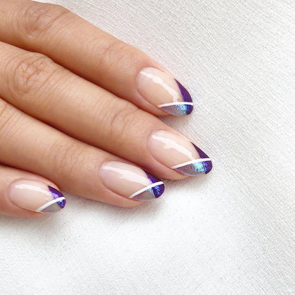 Также часто фиолетовый цвет сочетают с яркими цветами, такими как розовый, голубой, зеленый или мятный. При добавлении разнообразных оттенков и цветов к фиолетовому французскому маникюру стоит учитывать и тот момент, что более темные цвета будут утяжелять такой маникюр, а более светлые будут его смягчать. Необходимо правильно и грамотно дозировать количество контрастного цвета, чтобы избежать неправильных эффектов.
