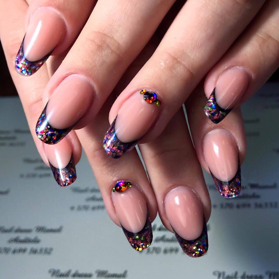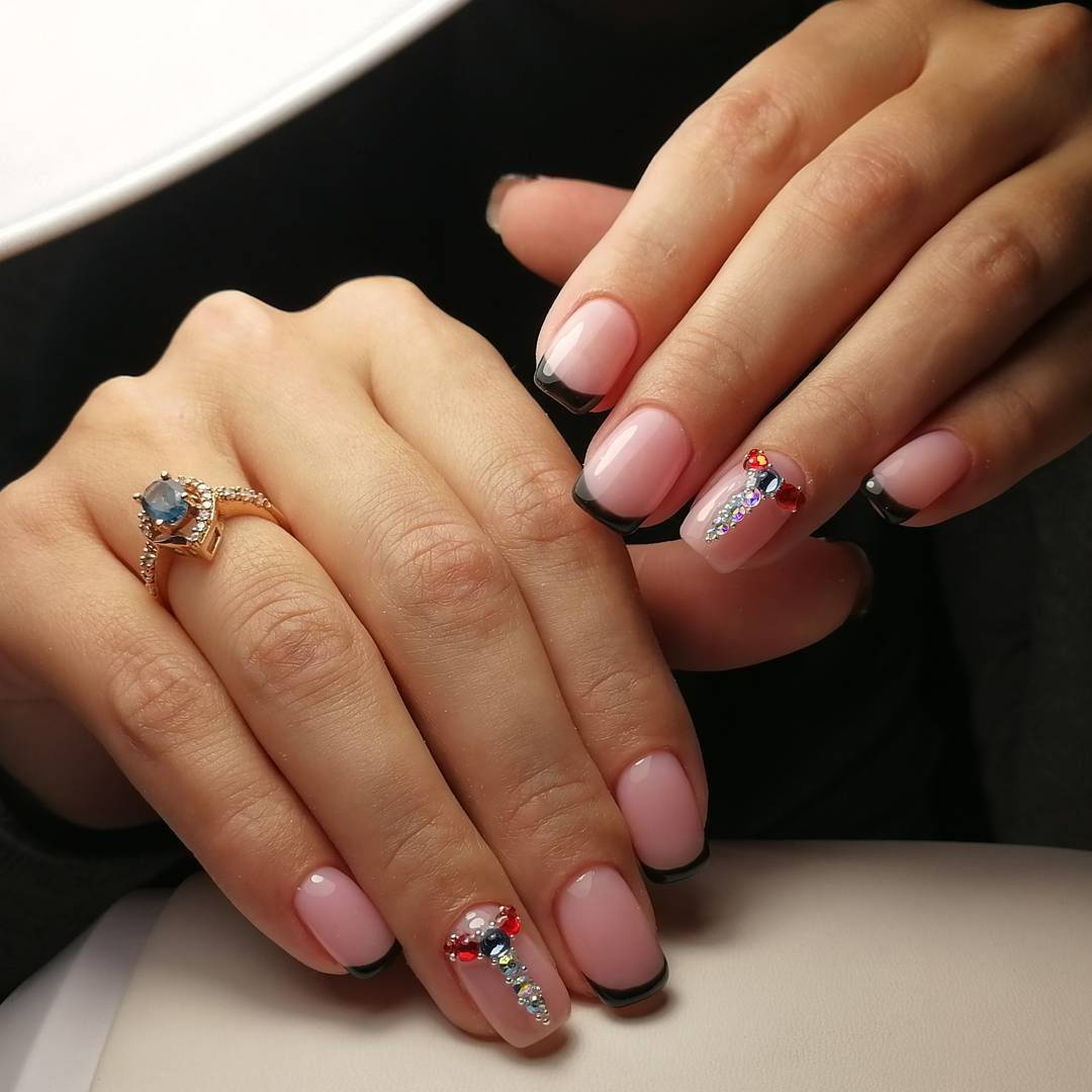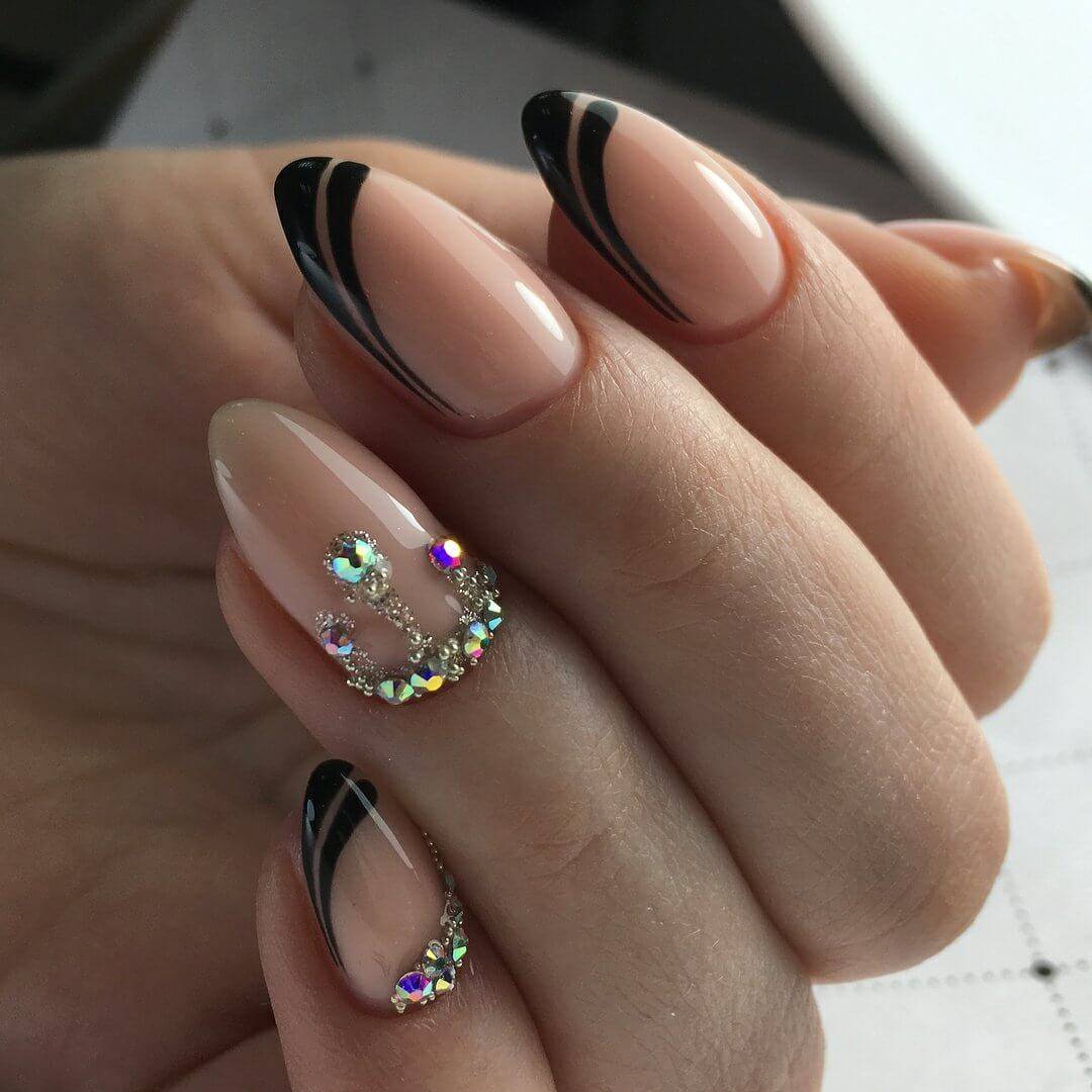 Черный френч отлично сочетается с блестками, камнями (особенно в матовом топе), кружевом, рисунками.