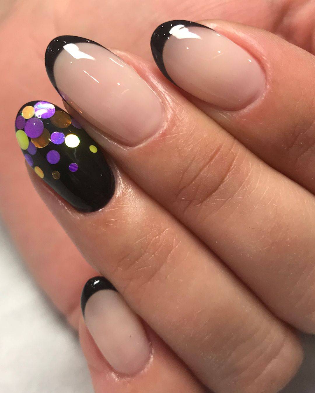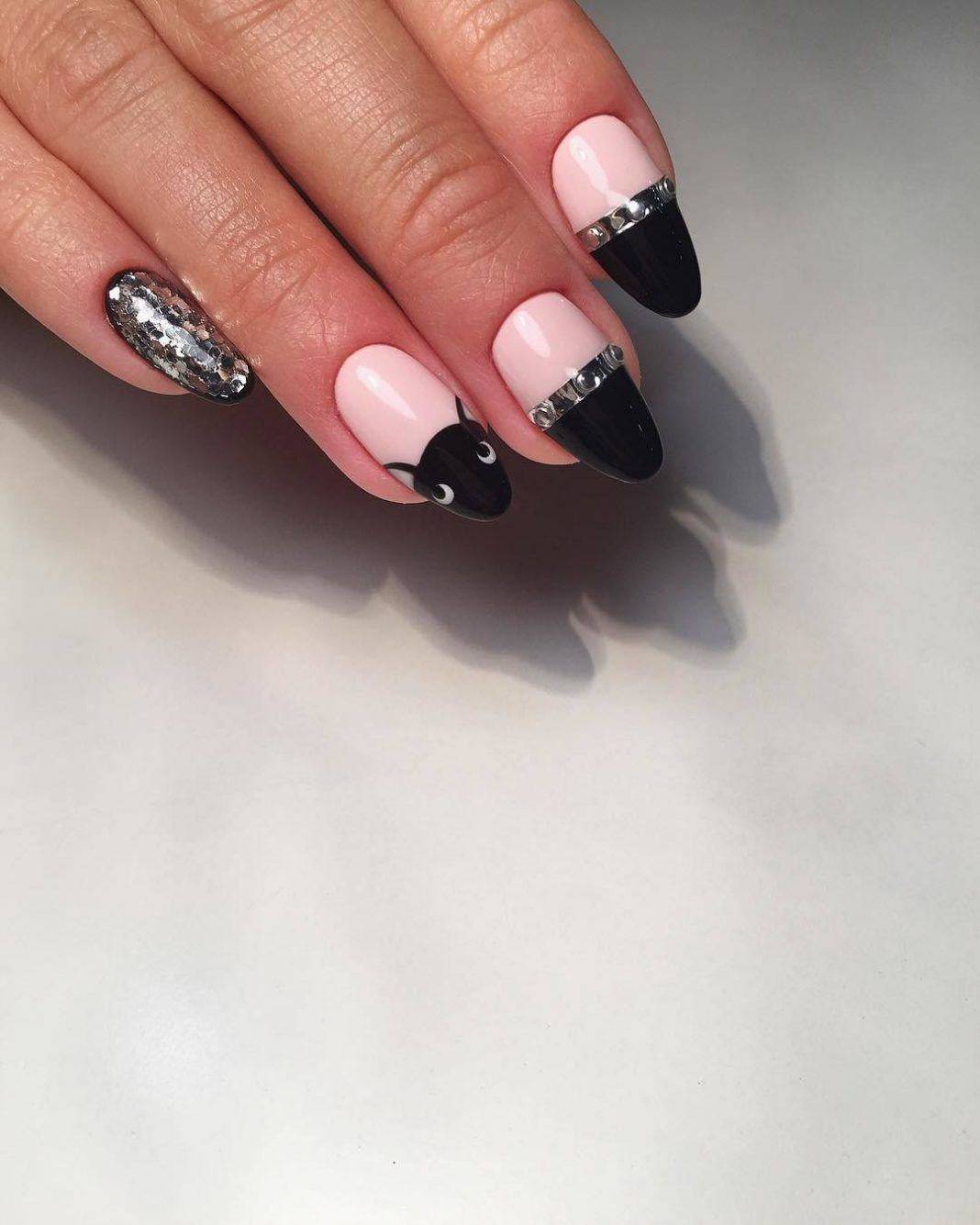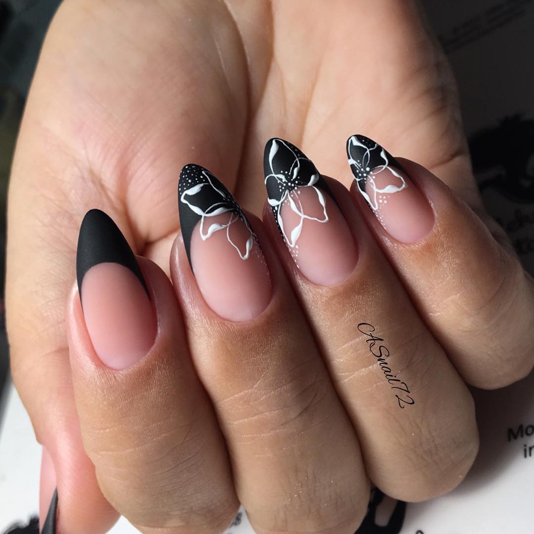 Черный френч отлично сочетается с блестками, камнями (особенно в матовом топе), кружевом, рисунками.