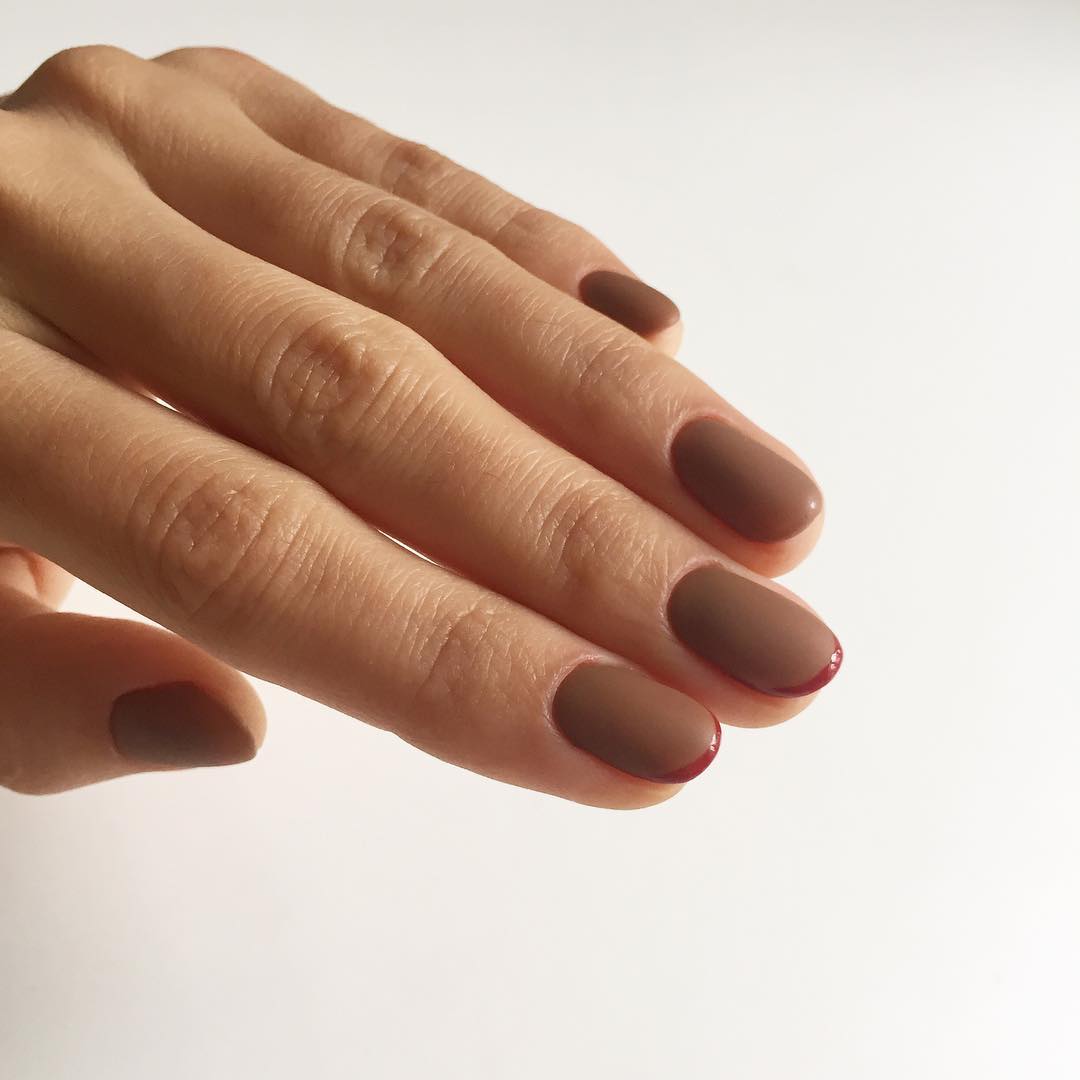 Если предыдущие варианты кажутся слишком простыми, то предлагаем сделать френч с действительно необычной линией улыбки. К примеру, тонкая, еле заметная линия в тон основному покрытию – один из самых популярных вариантов у обладательниц коротких ногтей.