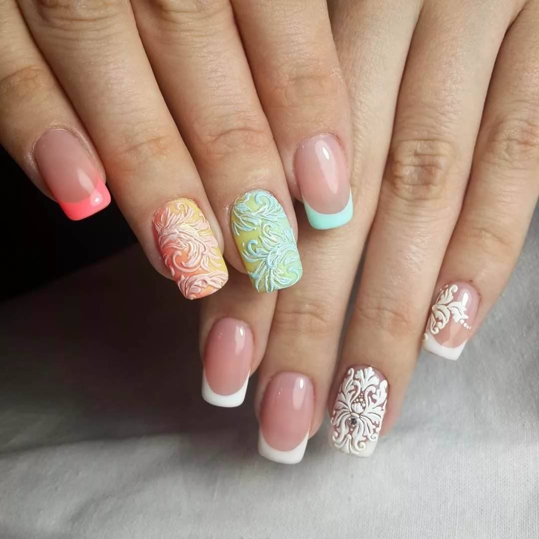 - Использование нежных, ярких оттенков гель-лака, перекликающихся с дополнительными акцентами или контрастирующих с основой;