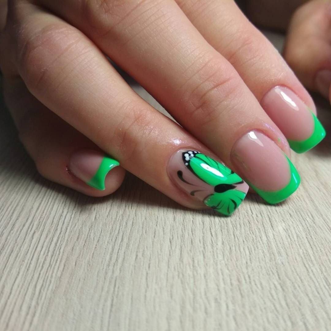 Поскольку цветной французский маникюр чаще всего достаточно яркий, его можно смело комбинировать с соответствующим рисунком. Изображение бабочек в данном случае будет смотреться невероятно красиво и лишь подчеркнет оригинальность маникюра. Чтобы дизайн выглядел реалистично, лучше всего использовать слайдер-дизайн с напечатанным рисунком. Выбранный фрагмент необходимо разместить в небольшом количестве воды буквально на минуту. После чего с помощью апельсиновой палочки надо аккуратно перенести его на ноготок. Затем просто закрепите рисунок лаком.