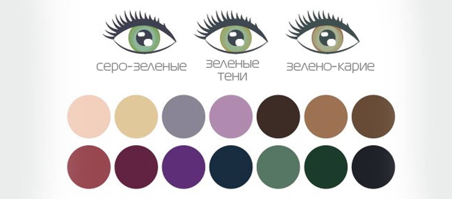 Зеленые загадочные глаза помогут подчеркнуть темно-зеленые, все оттенки фиолетового, лиловые, темно синие, светлые: бежевые, персиковые, оливковые и кирпичные тени. Главное – правильные пропорции цветов.