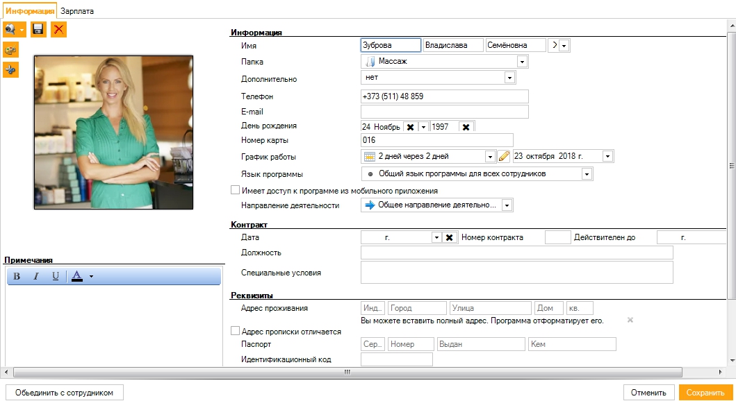 В программах для управления салоном красоты у каждого сотрудника есть карточка, в которой можно указать паспортные данные, сведения о контракте, график работы, зарплатную формулу и многое другое. Если функционал позволяет, можно предусмотреть даже премии за продажи товаров или рекомендации услуг другого сотрудника.