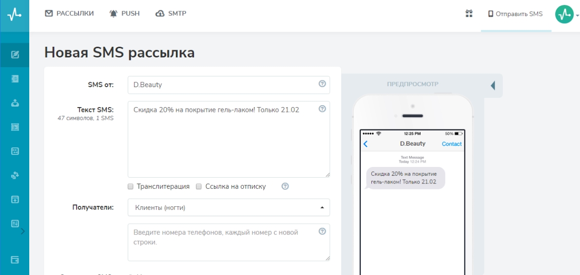 А с помощью предпросмотра вы увидите, как SMS будет выглядеть на смартфонах.