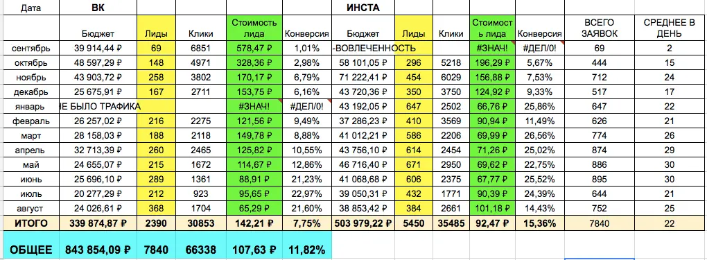 В таблице — общая аналитика рекламных кампаний за весь период:
