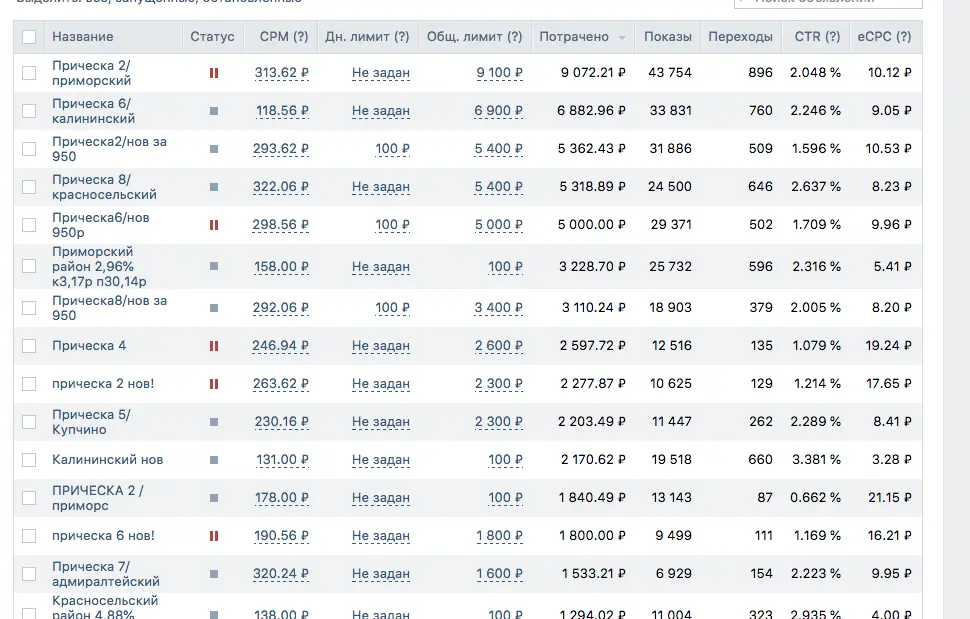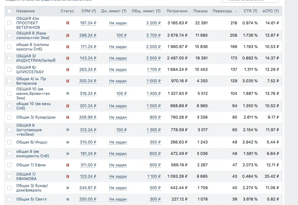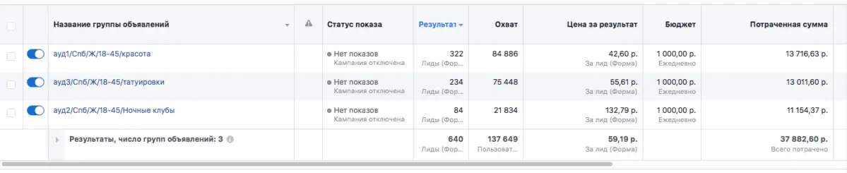 Ниже — статистика рекламных кампаний по наиболее удачным сегментам: