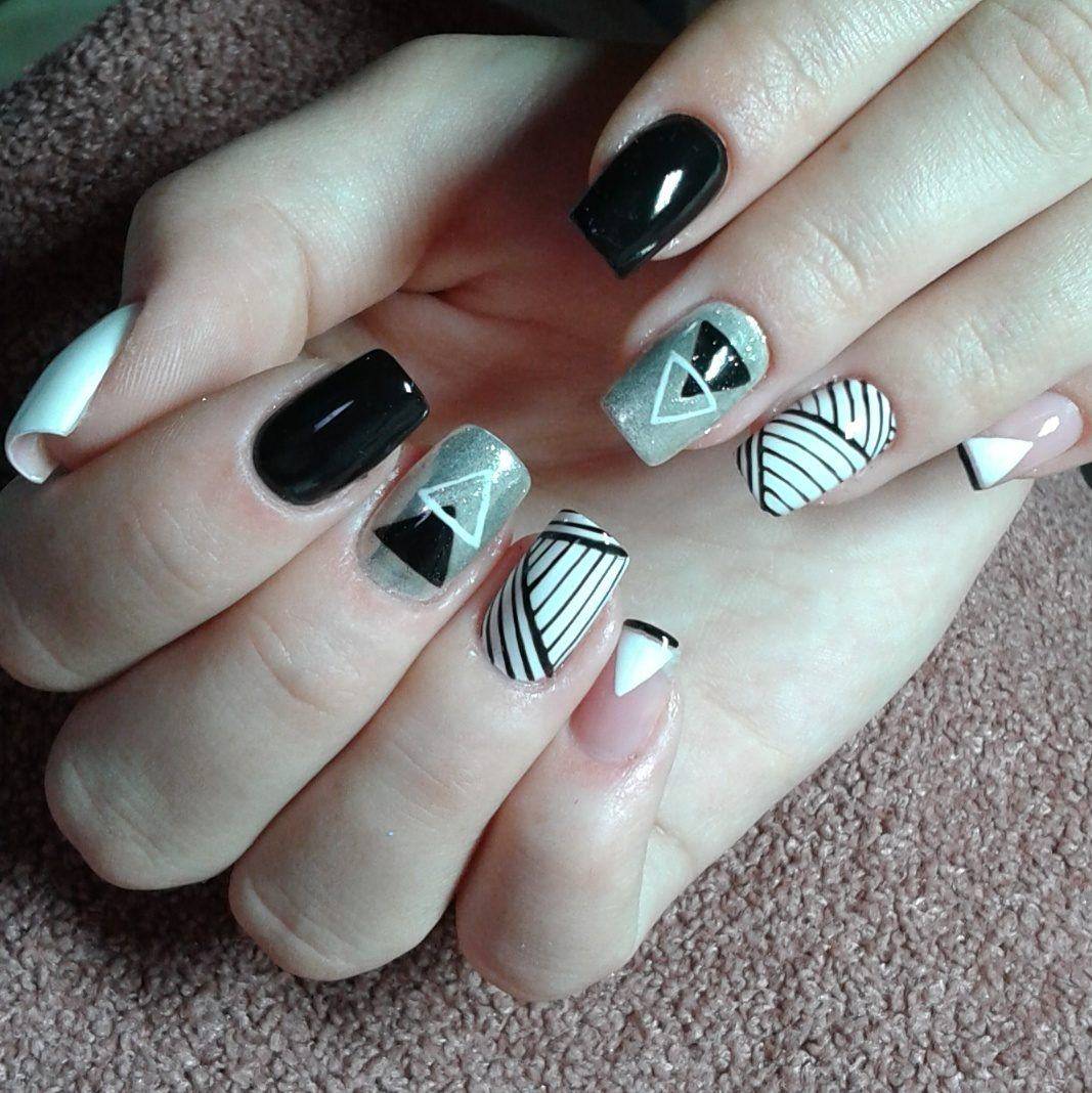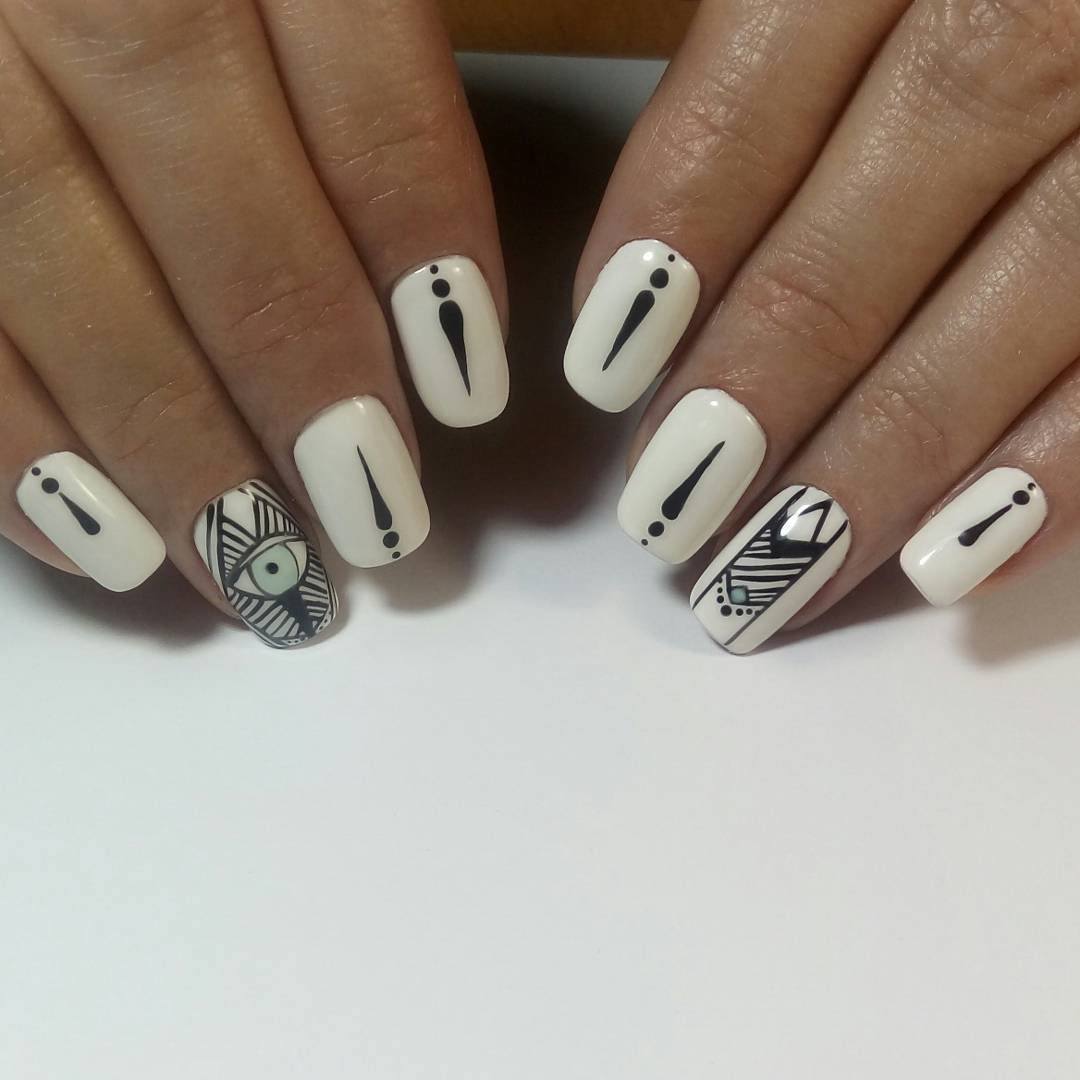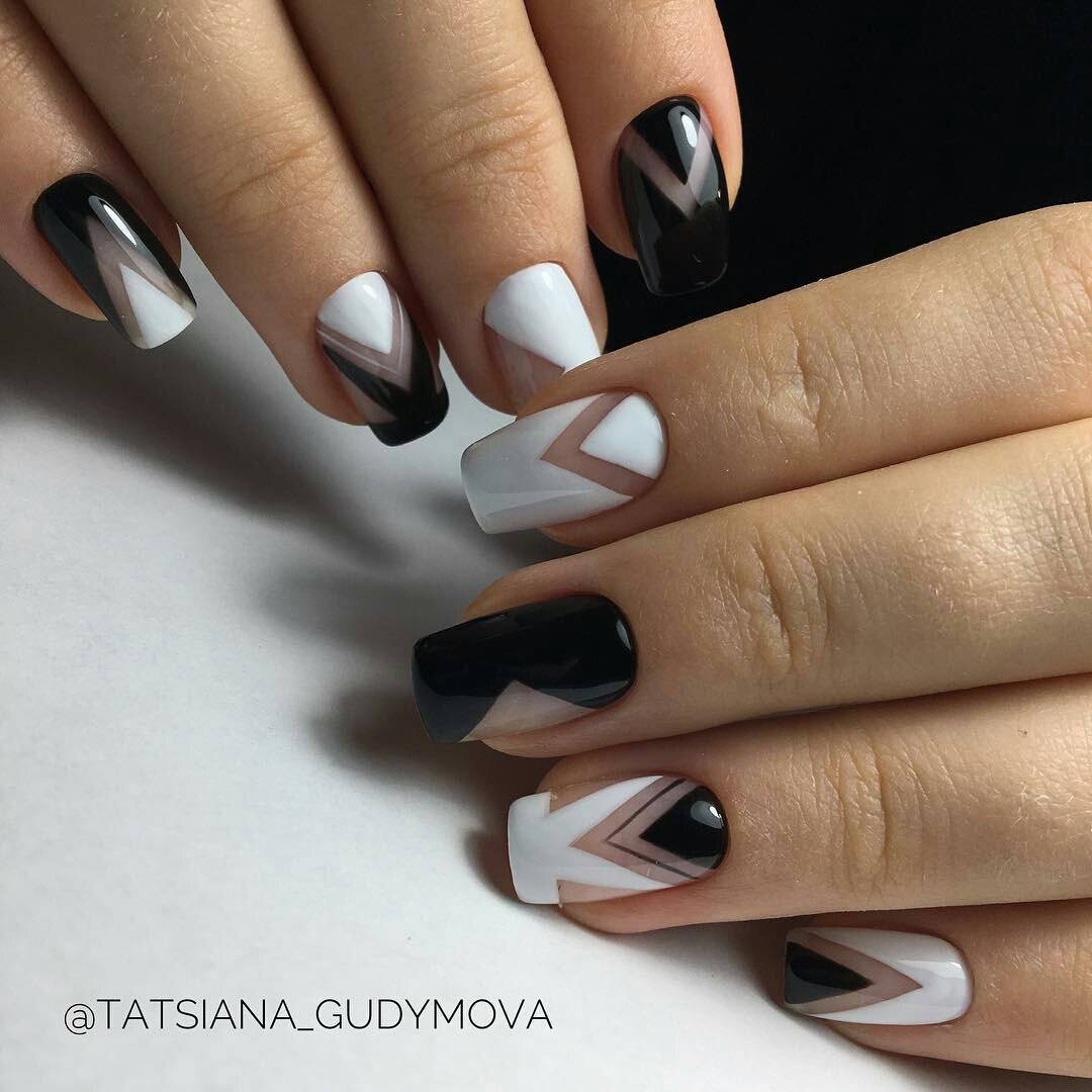 Добавление необычных дизайнов, как геометрия или абстракция, точек или произвольных линий сделают маникюр особенным. Даже простое покрытие с чередованием черного и белого будет красиво смотреться на ногтях.