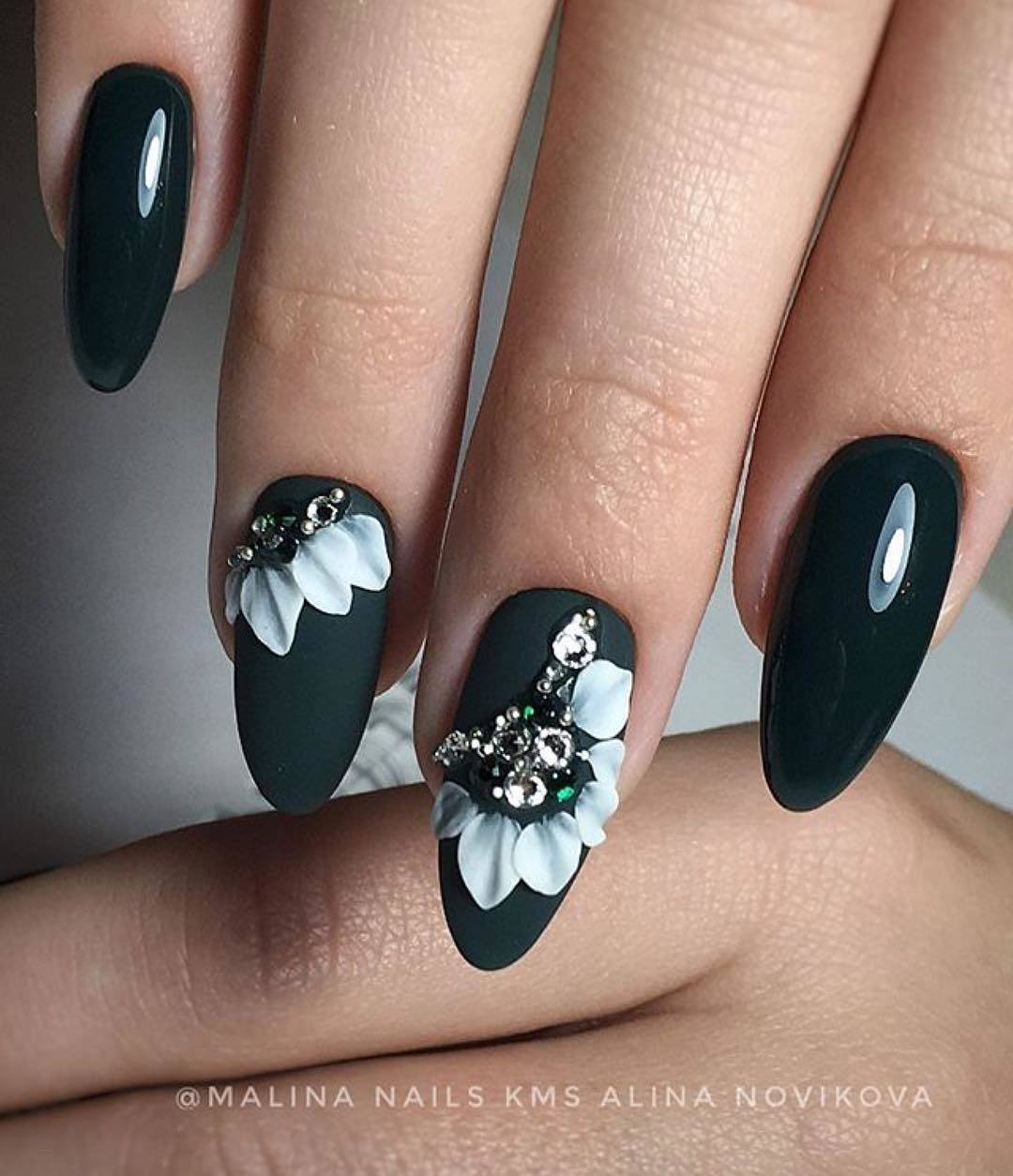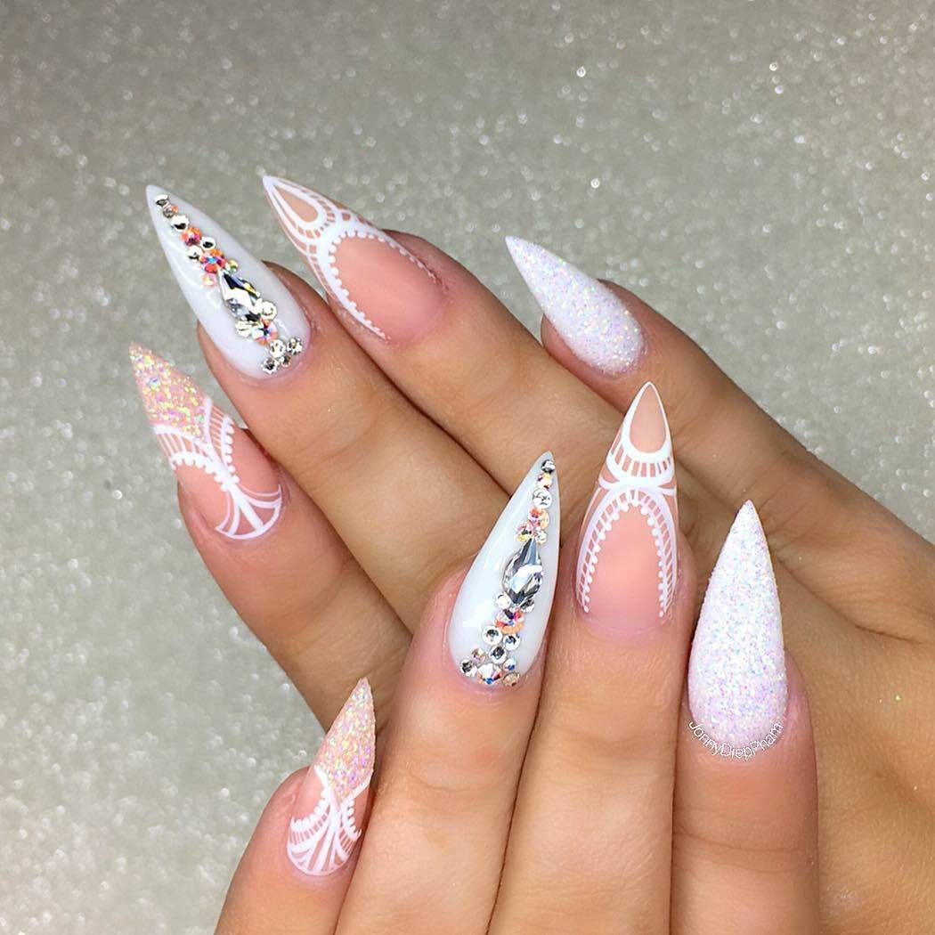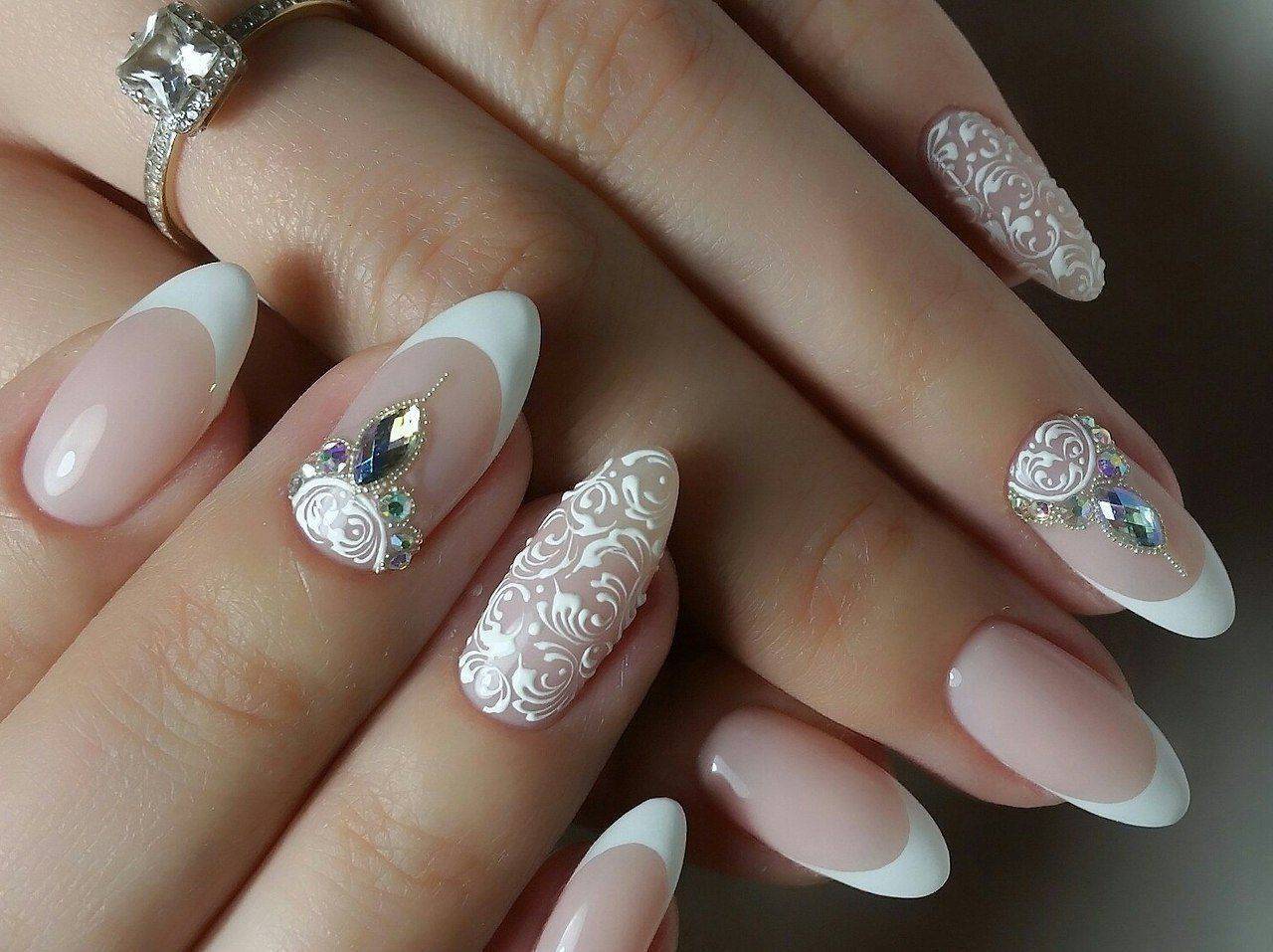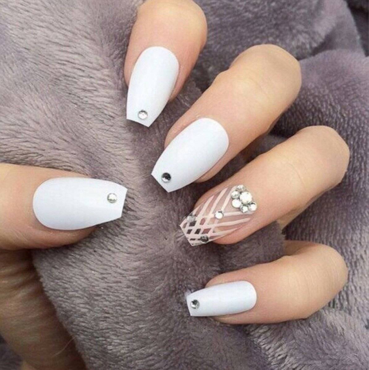 Для длинных ногтей с белым матовым покрытием декорирование является обязательным элементом маникюра. Это могут быть переливающиеся капельки страз, флористические лепные украшения, глиттер и т.д. Чтобы добавить образу женственности и романтичности на нескольких ногтях можно прорисовать тончайший кружевной орнамент, причем он может быть как контрастным, так и выполненным из светлых оттенков. В последнем случае «вуаль» добавить маникюру объем и выразительность.