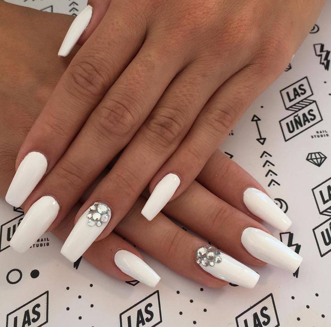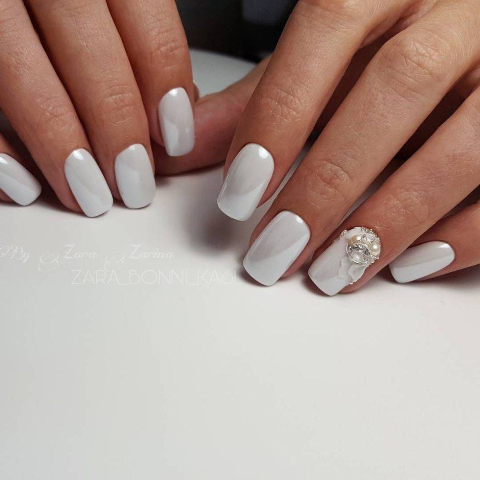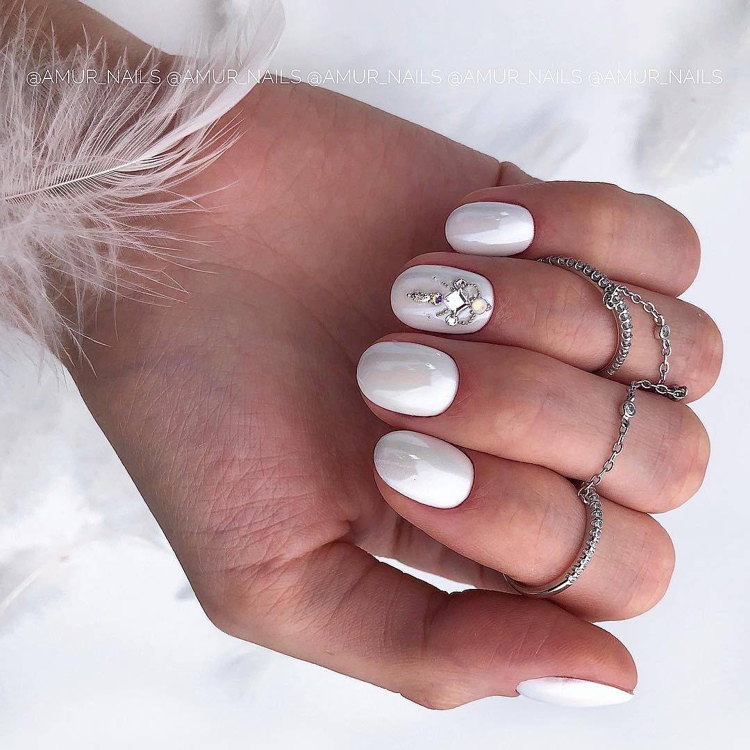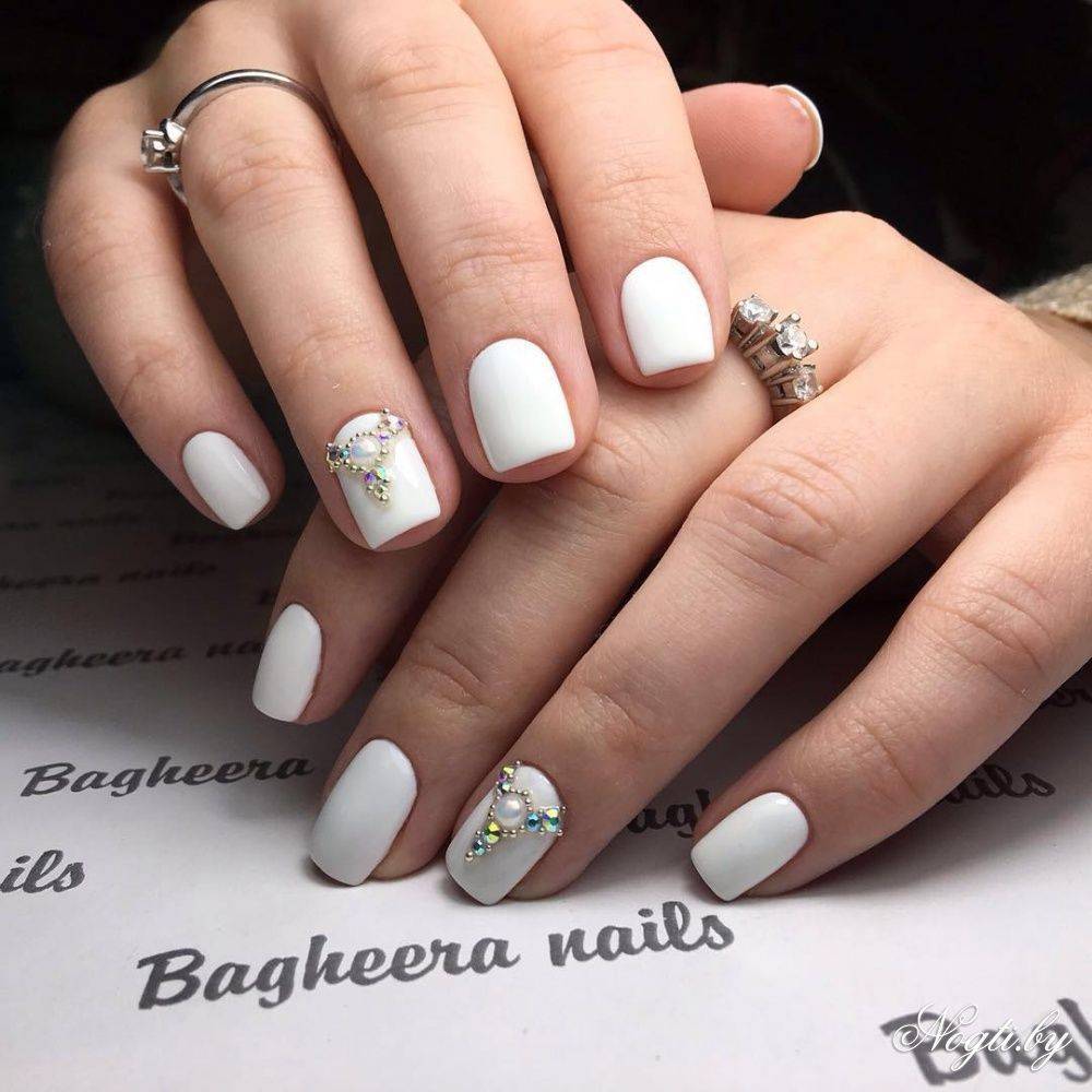 Такой декор, как стразы способен преобразить маникюр и изменить визуальное восприятие любого нейл-дизайна. Наличие всего одного-двух камешков позволит ногтям стать более выразительными и представит свою обладательницу в новом свете. На белом фоне стразы смотрятся особенно нежно и привлекательно. Хотите создать более женственный и романтический образ? Стразы и белый лак станут в этом случае вашей «золотой рыбкой».