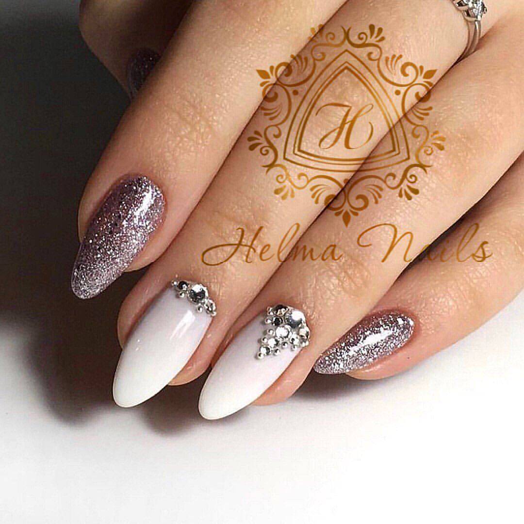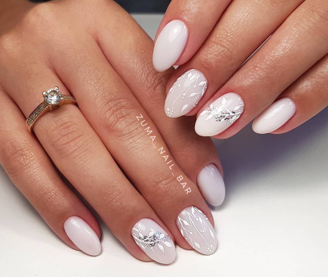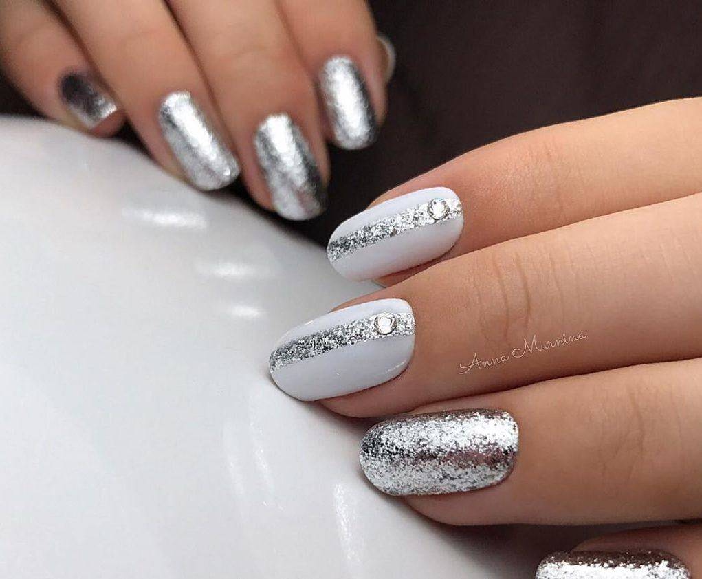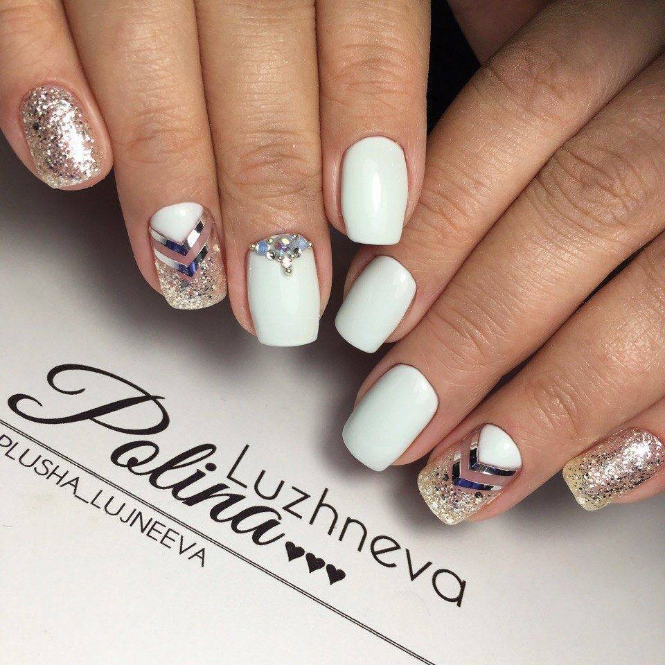 И, конечно, мы не могли не включить в наш мини-рейтинг варианты маникюра, в которых белые ногти украшаются золотыми, серебряными и другими блестящими элементами. Вариантов использования этого тренда может быть масса: от праздничного маникюра в белых тонах и объемными 3D-рисунками до минималистичной блестящей втирки или нежной росписи.