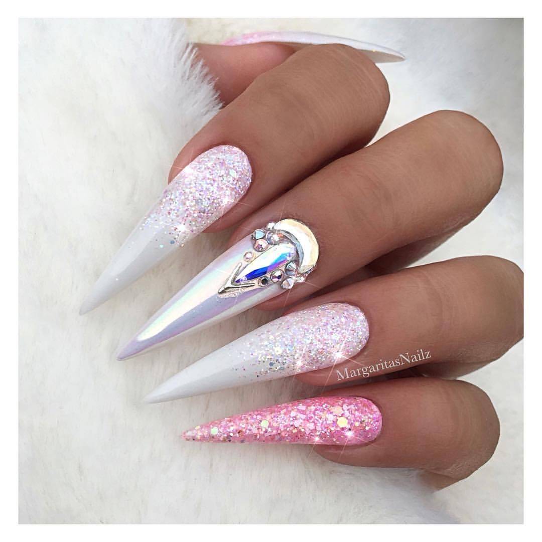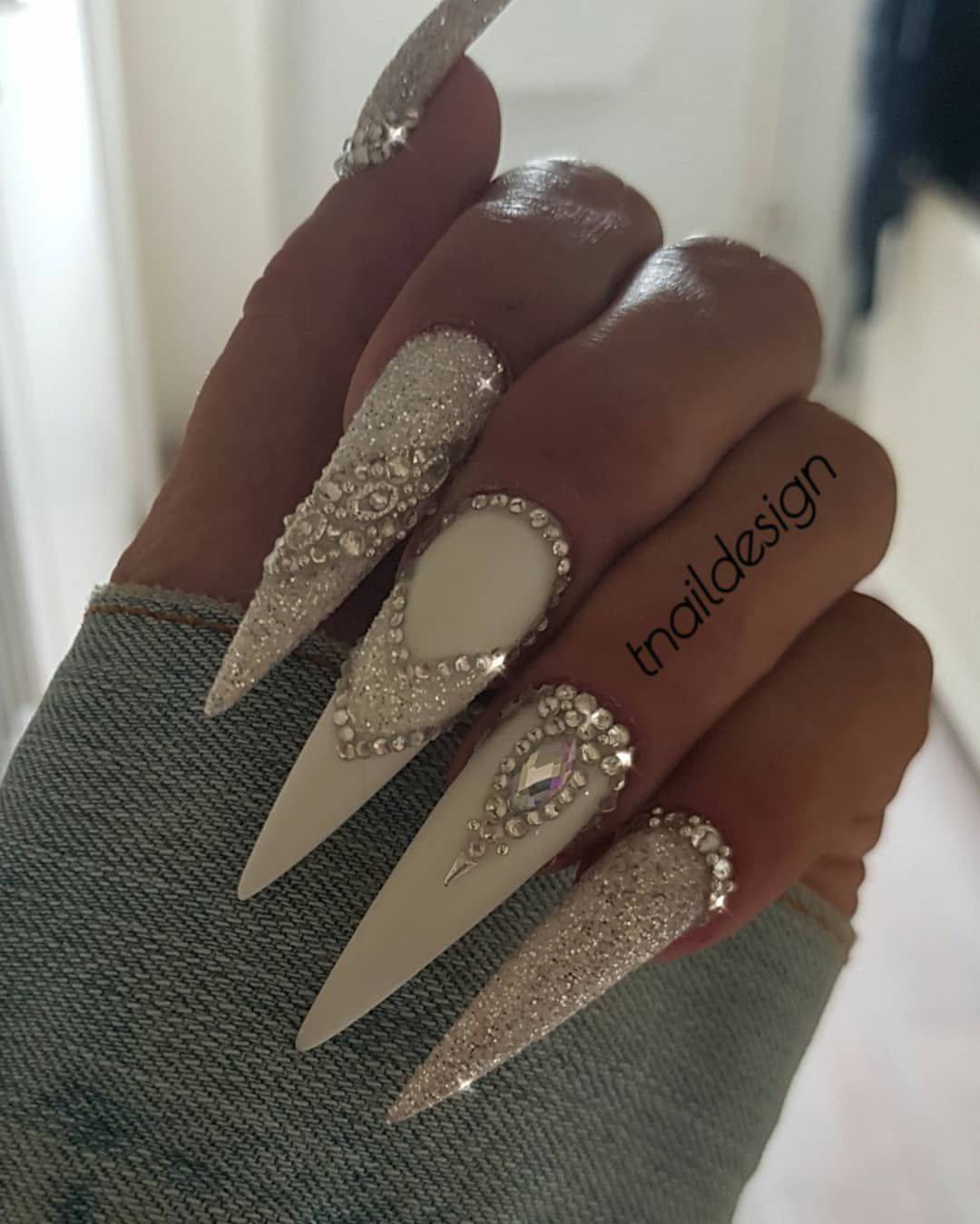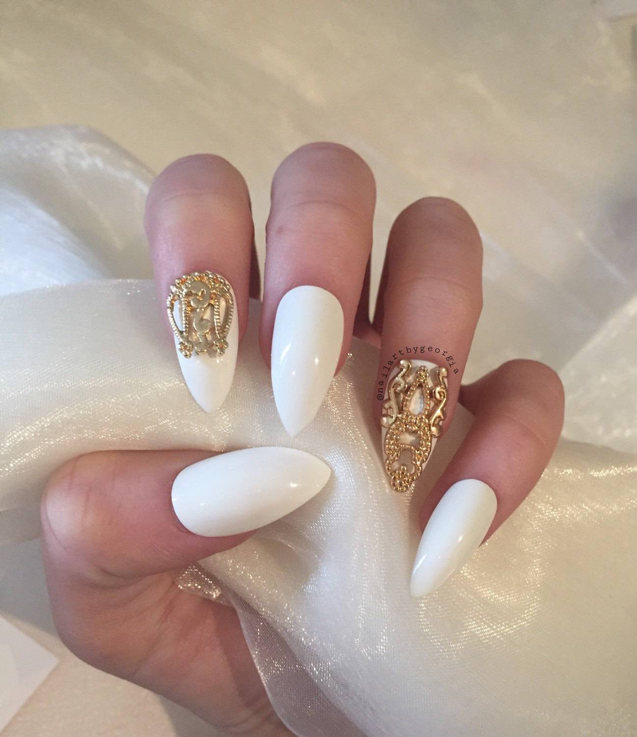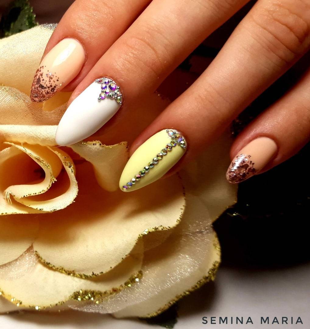 И, конечно, мы не могли не включить в наш мини-рейтинг варианты маникюра, в которых белые ногти украшаются золотыми, серебряными и другими блестящими элементами. Вариантов использования этого тренда может быть масса: от праздничного маникюра в белых тонах и объемными 3D-рисунками до минималистичной блестящей втирки или нежной росписи.