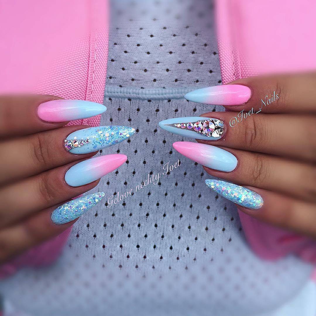 Небесный оттенок на пике популярности, а еще он безупречно выглядит в тандеме с белым. Пастельный голубой подойдет для техники омбре, чтобы получились нежные, мягкие переходы.