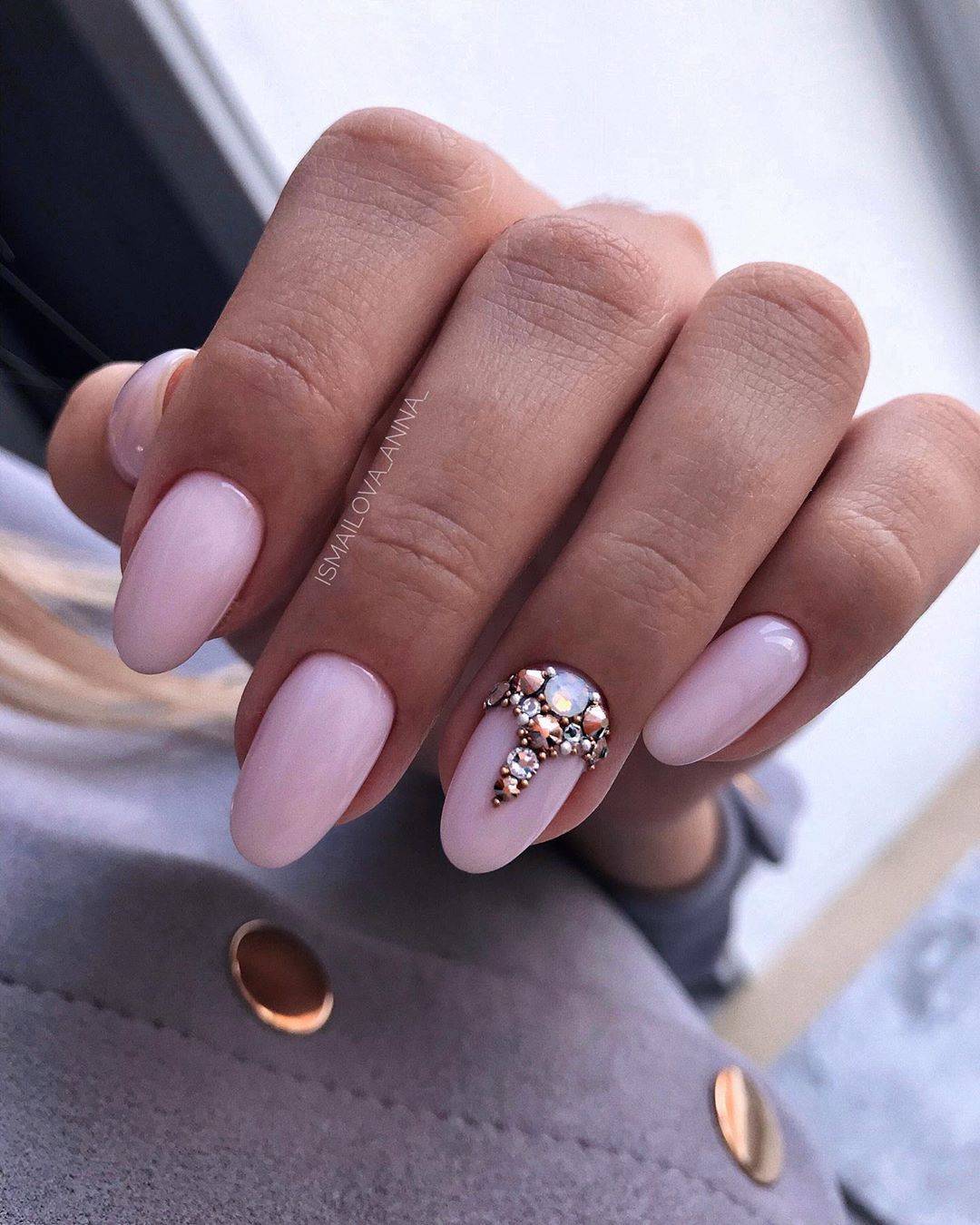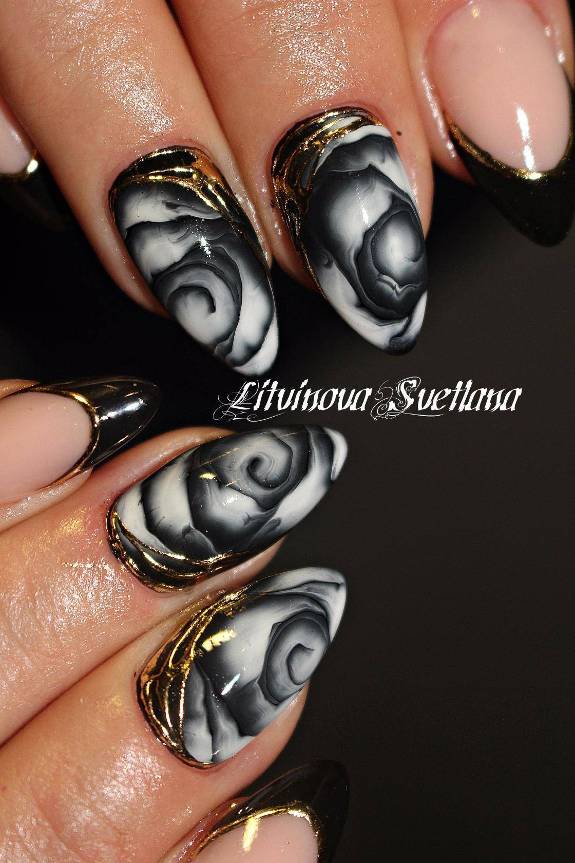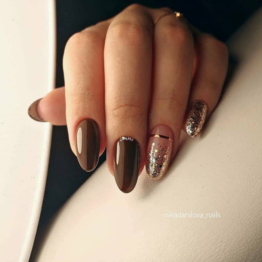 Лучше всего такой маникюр сочетается с ногтями круглой или овальной формы. В качестве золотой детали могут использоваться наклейки, фольга, блестящий песок, золотые камни.