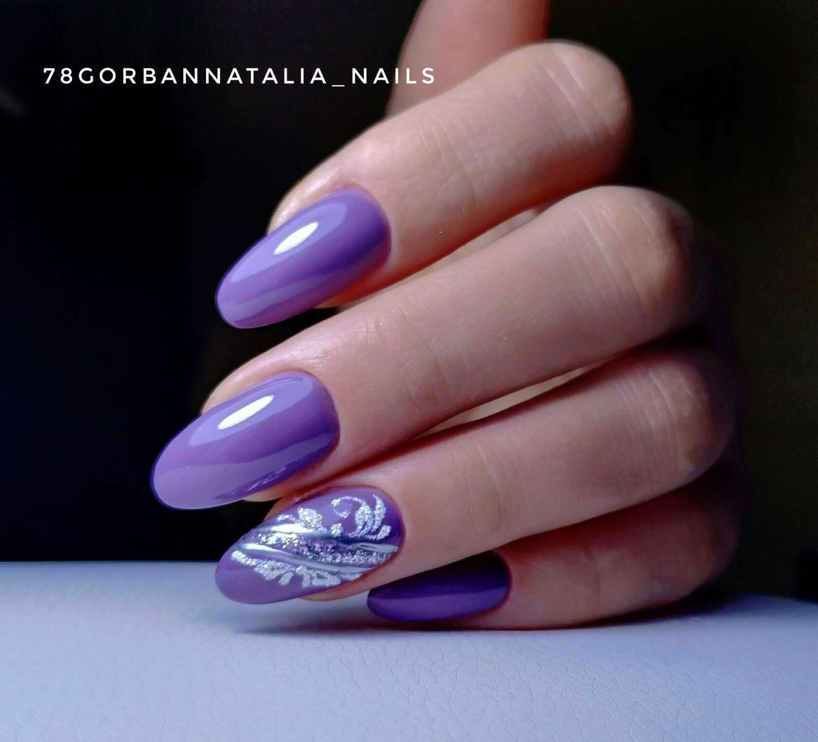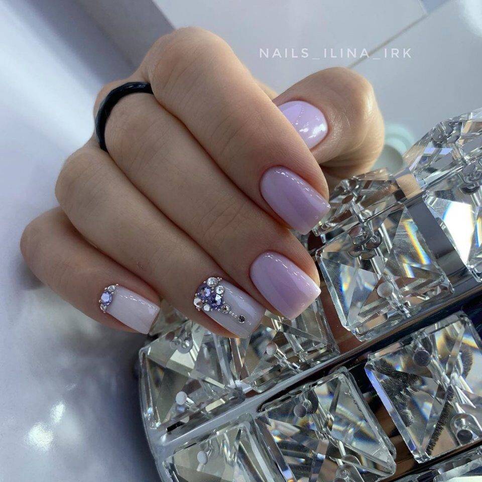 Светлые оттенки сиреневого отлично объединяются с белым цветом в таких техниках: френч, лунный маникюр, лунный френч, геометрия и т.д. Небольшое количество декора (стразы, блесточки, фольгированная лента) добавляют нейл-арту индивидуальности, не отягощая его. Для праздничного или вечернего маникюра можно выбирать более смелые оттенки фиолетового и большее количество декора.
