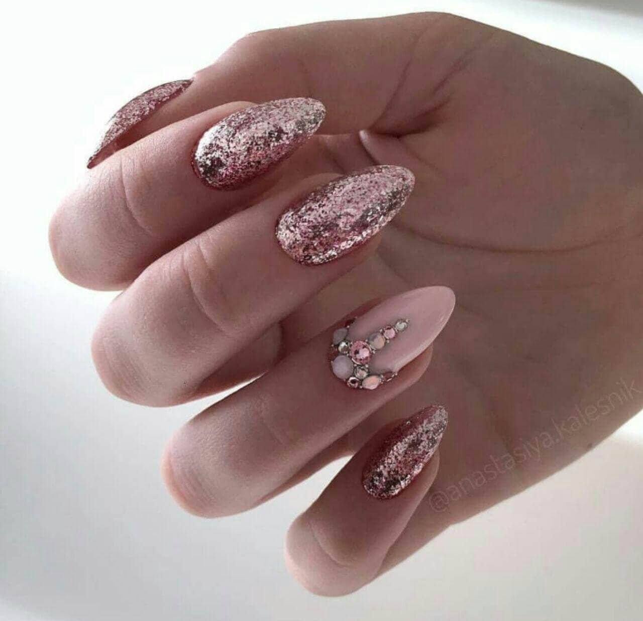 В завершение нашей публикации мы хотим предложить модницам несколько оригинальных идей миндалевидного маникюра, ведь иногда у каждой барышни случаются приступы апатии и всё привычное надоедает. Чтобы преобразить ноготки и создать что-нибудь «этакое» совсем не обязательно просиживать часами у монитора в поисках подходящих идей. У каждого мастера маникюра имеется в запасе несколько подобных решений, которые спасут ситуации. Среди актуальных предложений чудесные примеры оформления с россыпью блёсток и металлизированными полосками, потрясающий «пенный» маникюр с втиркой и блёстками, ноготки с элементами «негативного пространства» и сверкающих частиц, а также дизайн с гелем паутинкой на подложке из блёсток или невероятные абстрактные узоры. Впечатляет? С таким маникюром вы не только ощутите прилив энергии, но и почувствуете себя настоящей королевой!