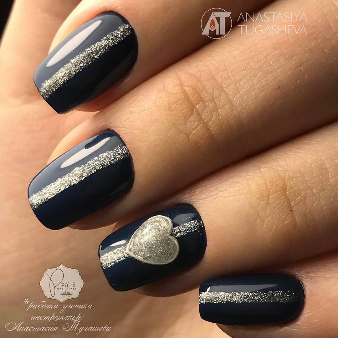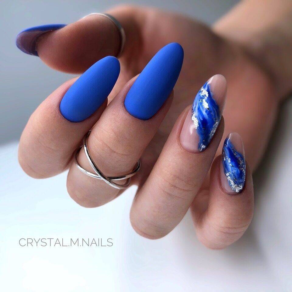 С синим надо быть осторожнее, это очень яркий контраст. Но если сделать цветной френч, нижние лунки покрасить в синий — то получится стильный дизайн. Белый отлично дополняет синий.