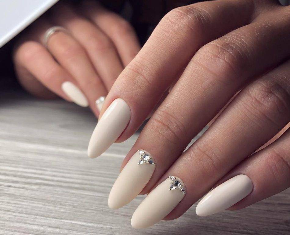 Спокойные тона — составляющие нюдового маникюра. Можно сделать глянцевый белый маникюр на длинные ногти, добавив матовый бежевый на пару ноготков.
