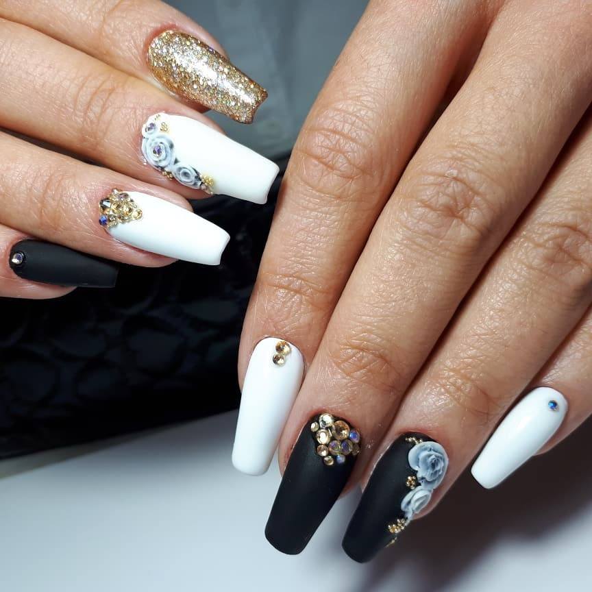 Различные геометрические рисунки на ногтях уже давно считаются признаком хорошего вкуса и стиля. К тому же это один из прекрасных способов выглядеть максимально современно. Подобная техника подразумевает не только наличие полос и зигзагов, но и создание «неправильных» узоров и смелых форм. Можно оформить на каждом ноготке индивидуальный рисунок, а можно использовать конкретные изображения. Здесь всё зависит от вашего настроения и вкусовых пристрастий. Блёстки и различные украшения в качестве дополнения только дополнят чёрно-белую геометрию нотками шарма.