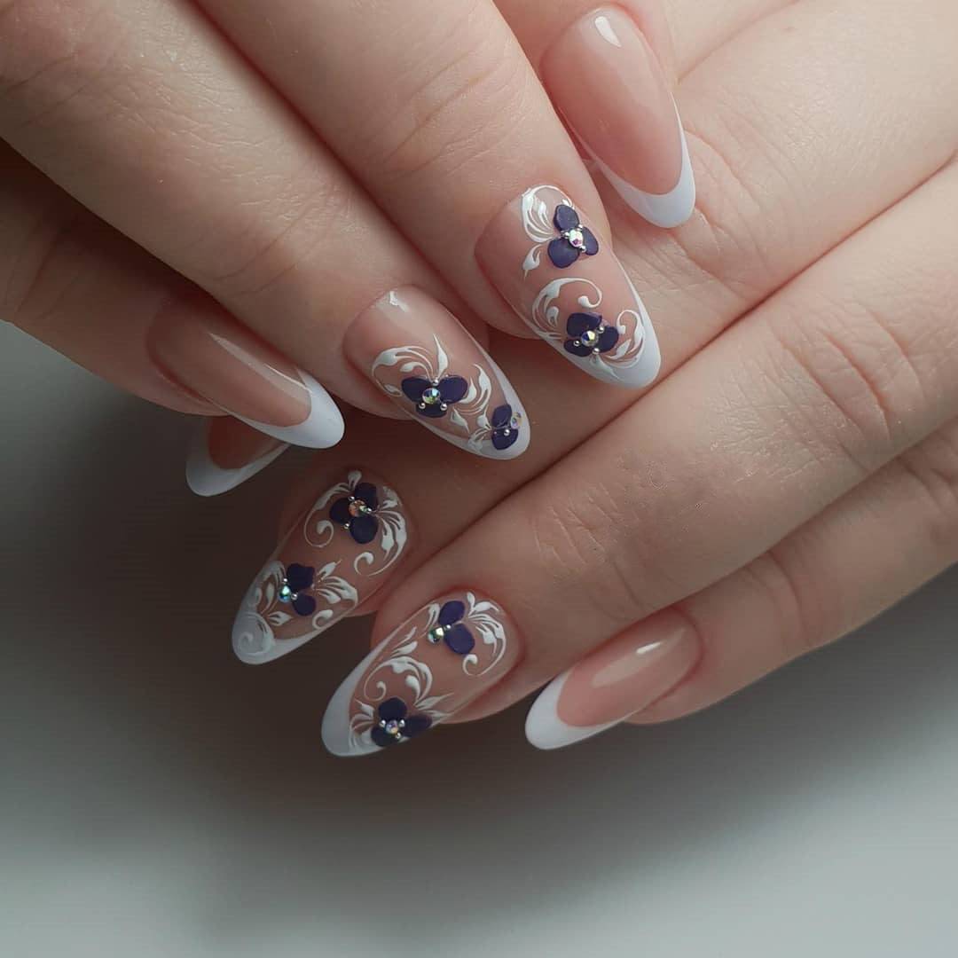 Белый с голубым или синим – это очень нежное сочетание цветов. Для дизайна ногтей могут быть использованы как цветные стразы на белом фоне, так и роспись или наклейки.
