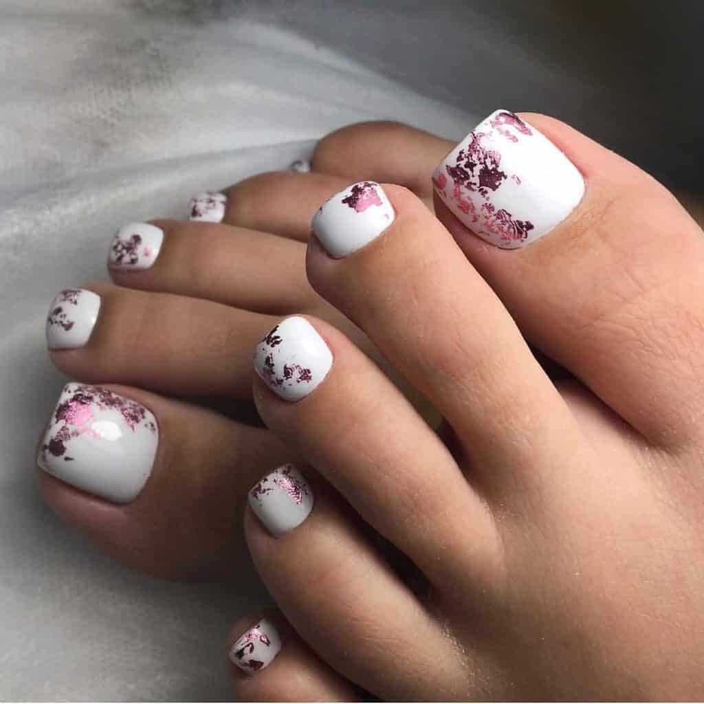 Не теряет актуальности декорирование ногтей фольгой. Это один из самых простых в использовании материалов, при этом вариантов декоров с фольгой множество. С ее помощью можно создать эффект битого стекла, жидкого металла, поставить хаотичные блестящие отпечатки на ноготках. Если вы подбираете педикюр на торжество, это один из самых удачных вариантов декора.