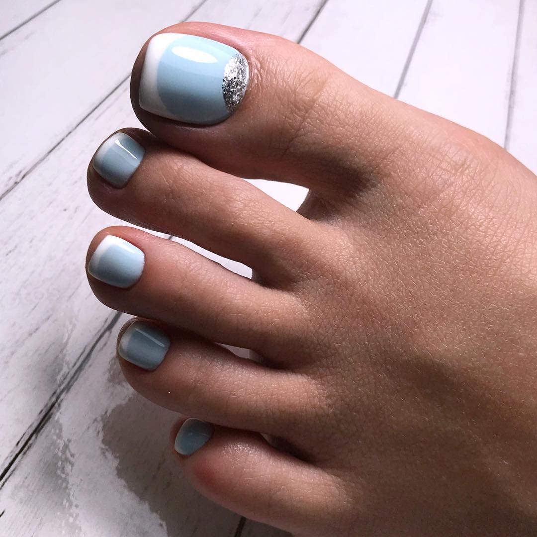 Стильно и мило выглядит сочетание голубого с белым цветом. На этом фото демонстрируется красота французского маникюра в голубых с белым тонах. Акцентом является серебристая лунка. Такой педикюр сочетает в себе сразу 2 дизайна. Это сочетание наиболее удачно, так как белый и голубой – родственные оттенки.