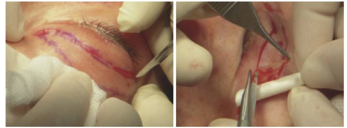 В настоящее время вместо удаления полоски круговой мышцы глаза выполняем разрез лазером в проекции “грыжи”. Лишь только при иссечении широкой полоски кожи, производится удаление полоски мышцы.