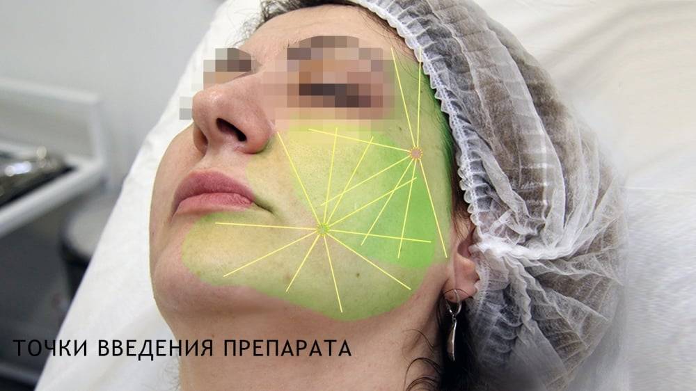 Введение препарата выполняется веерной техникой всего из 2-3 проколов на каждой стороне лица!