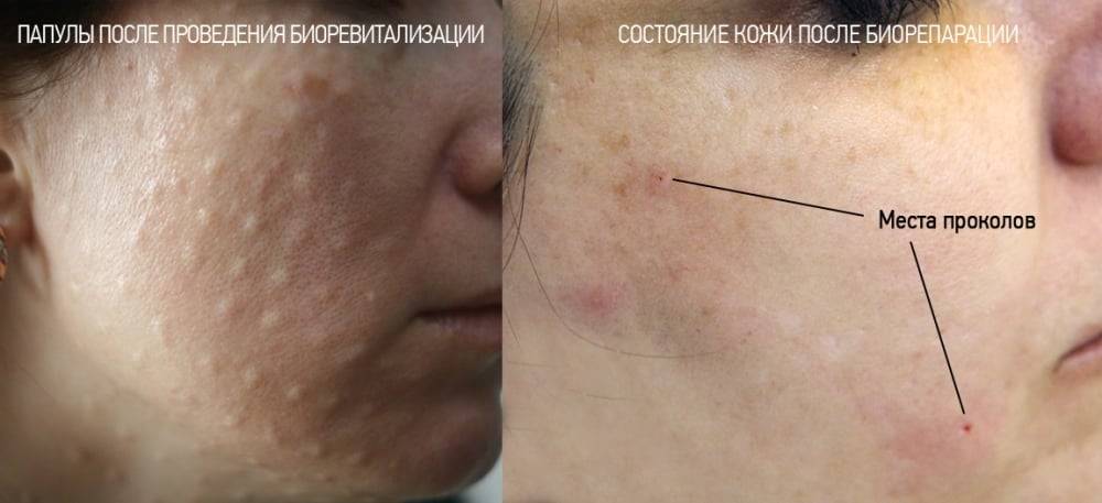 Во-первых, глубина введения препаратов биорепарации должна быть глубже — ведь они содержат не только гиалуроновую кислоту. А главное – нет папул, которые рассасываются только через 12-30 часов!