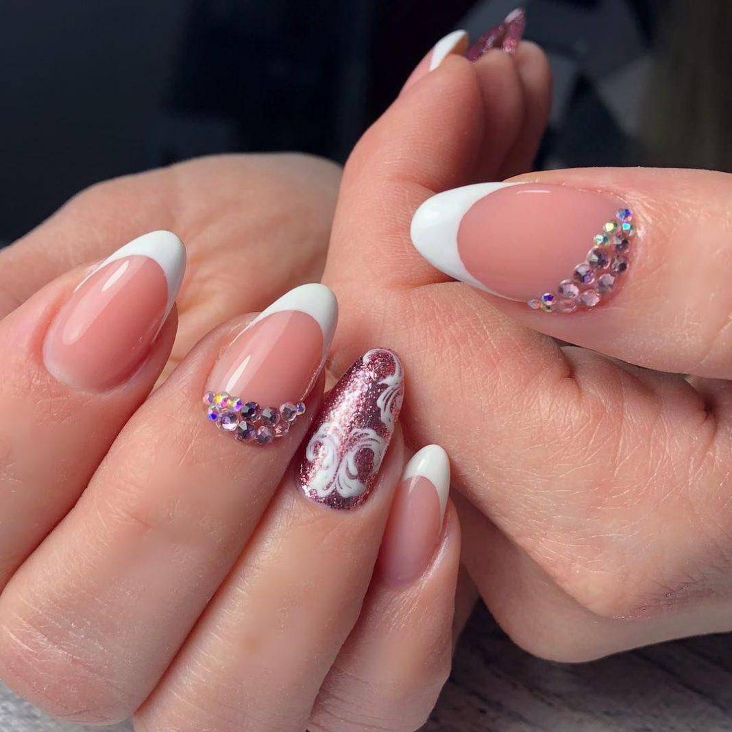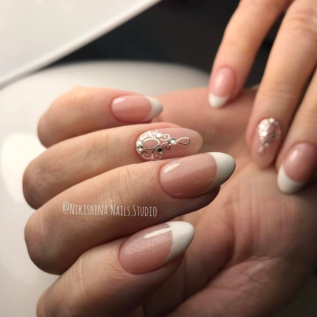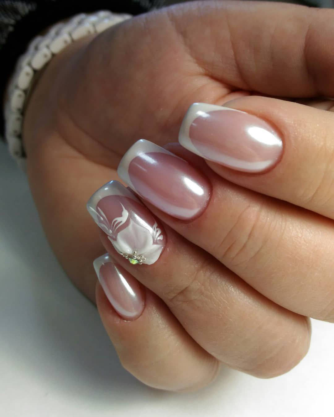 Как и всегда, французский маникюр достаточно актуальный и востребованный. Причем речь идет не только о классическом варианте, но и о современных решениях. Не слишком крупные рисунки прекрасно смотрятся на нескольких ноготках. В основном среди них цветочные и флористические мотивы, геометрия, абстракция и вензеля. В летнем сезоне френч часто дополняют изображения фруктов, ягод и бабочек. Поскольку данный вид дизайна часто делают на свадьбу, то рисунок также должен быть тематическим. Яркости маникюру придают блестки, но интенсивность зависит от выбранного варианта и плотности нанесения. Шиммер, глиттер и конфетти дают совершенно разный эффект на ноготках.