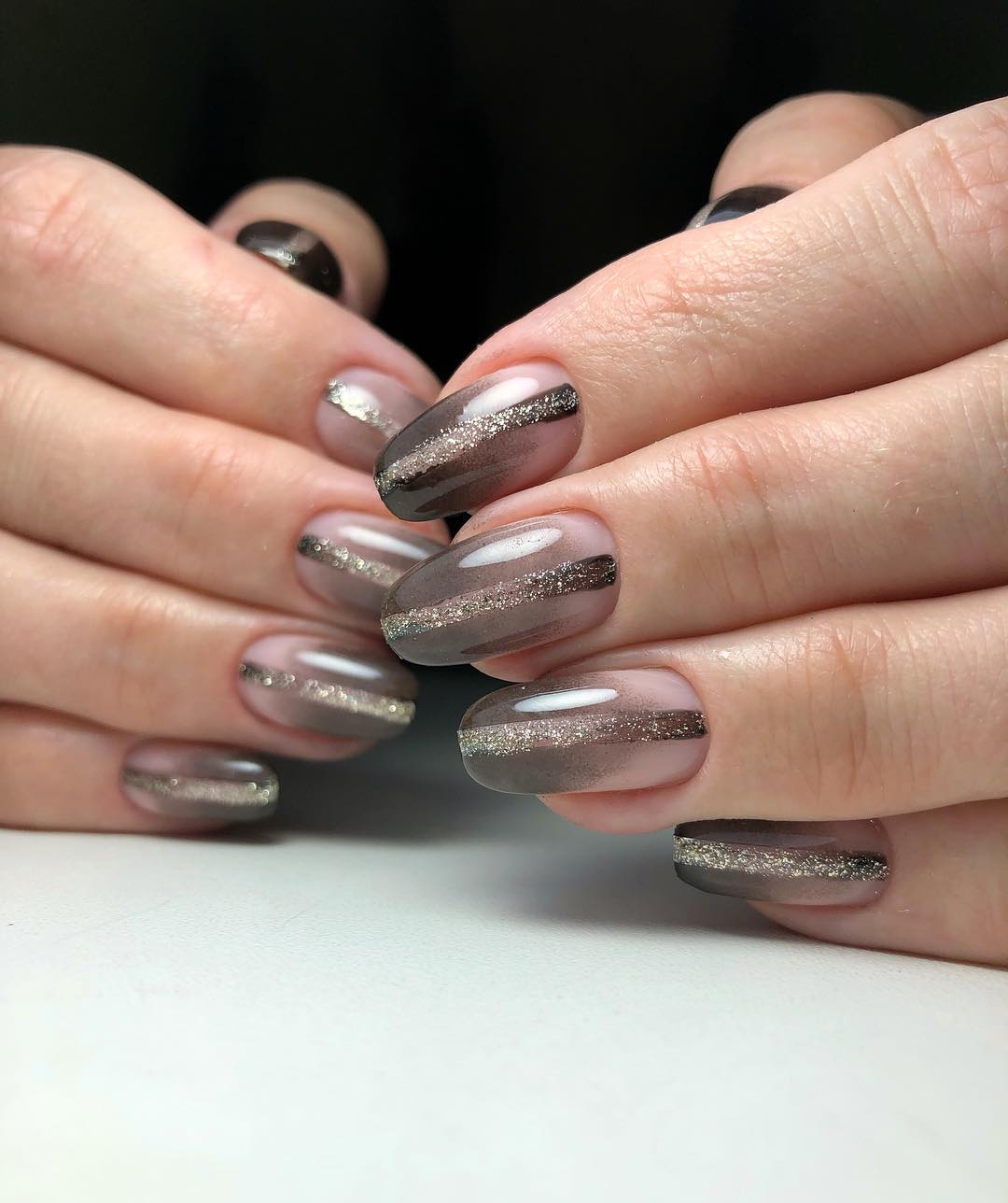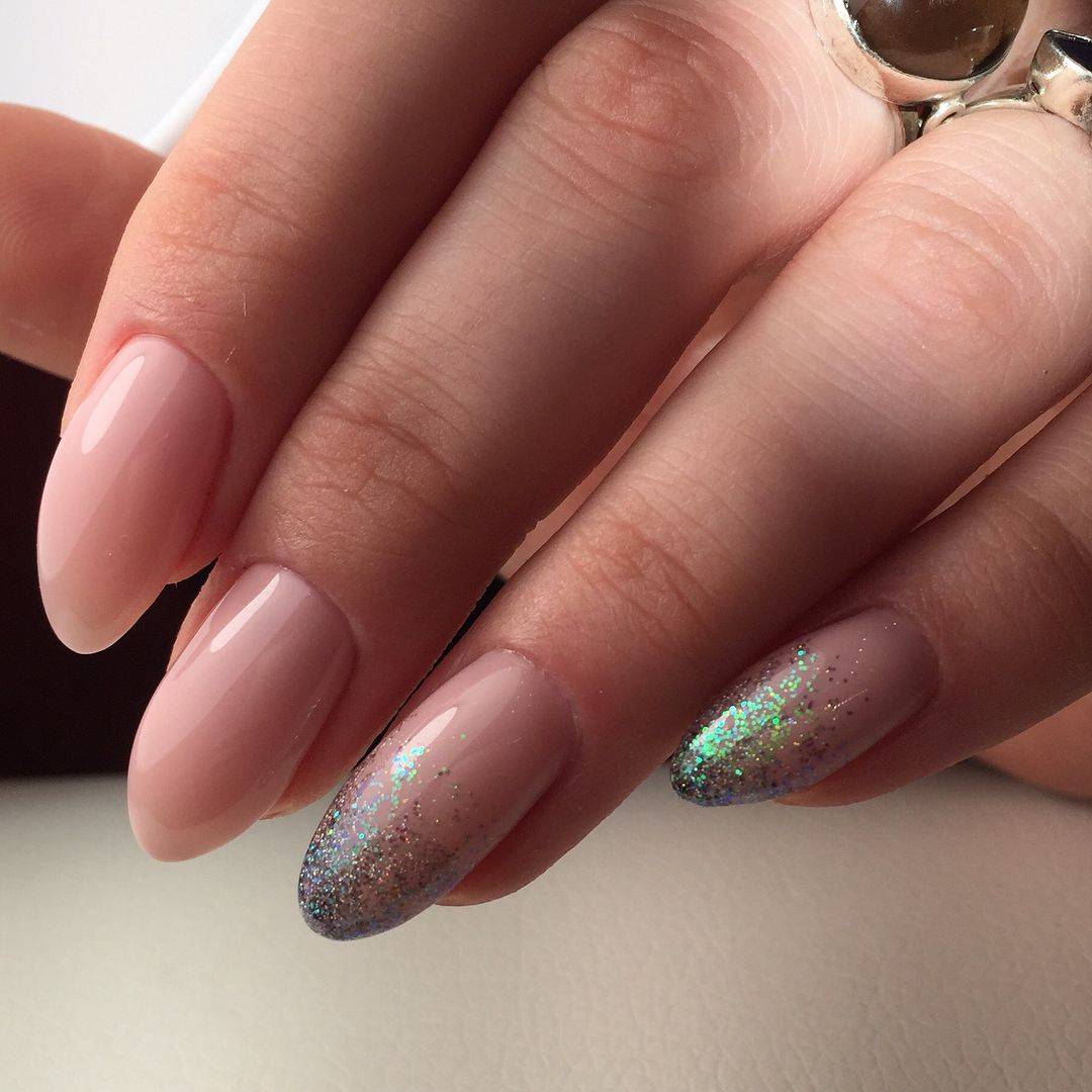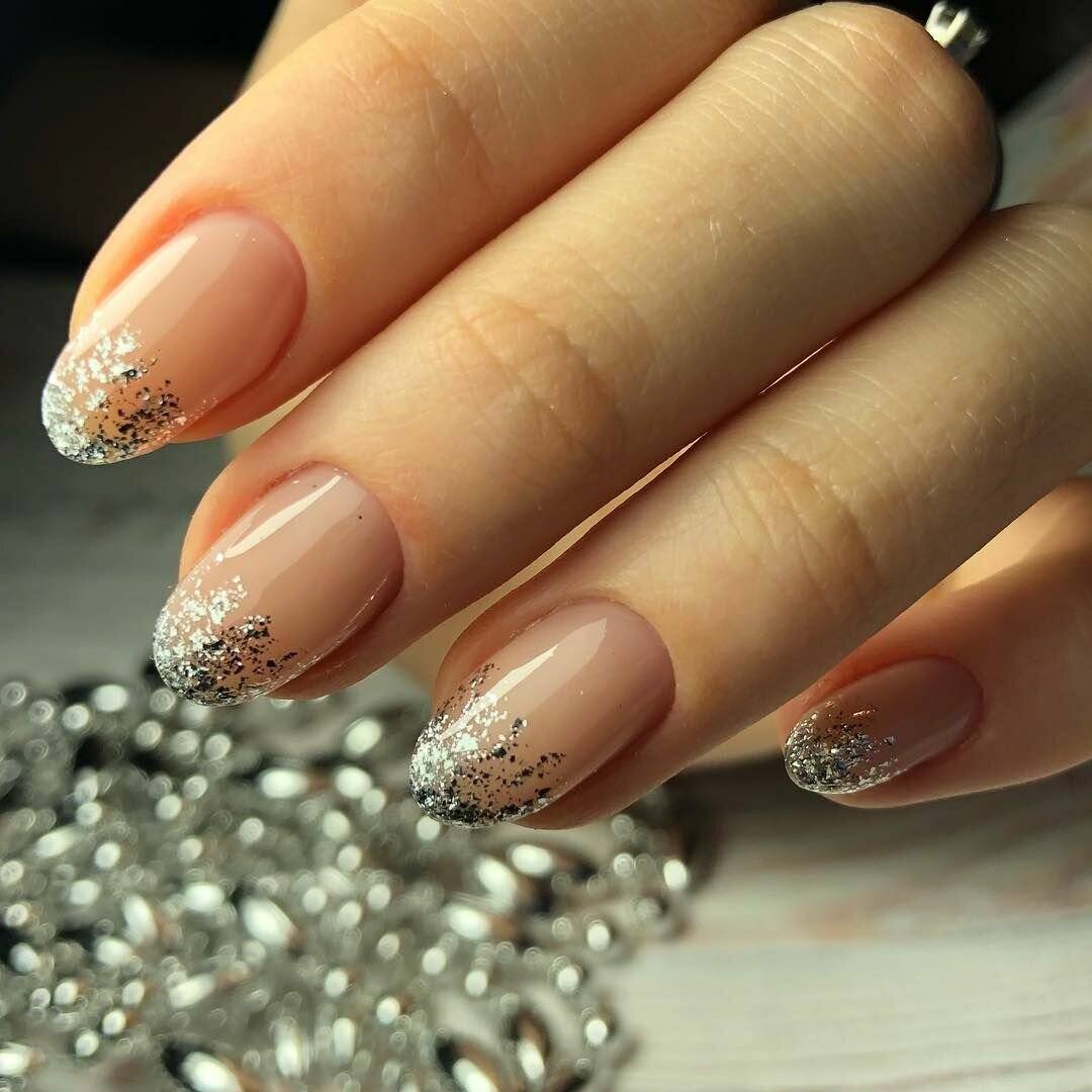 Чтобы связать блестящие и нюдовые ноготки – слегка задекорируй глиттером кончики. Получается сдержанный, но лаконичный праздничный маникюр на короткие ногти.