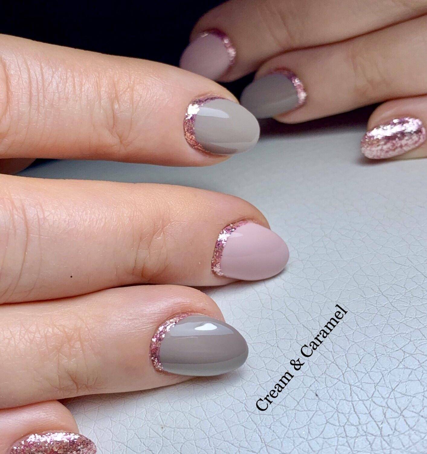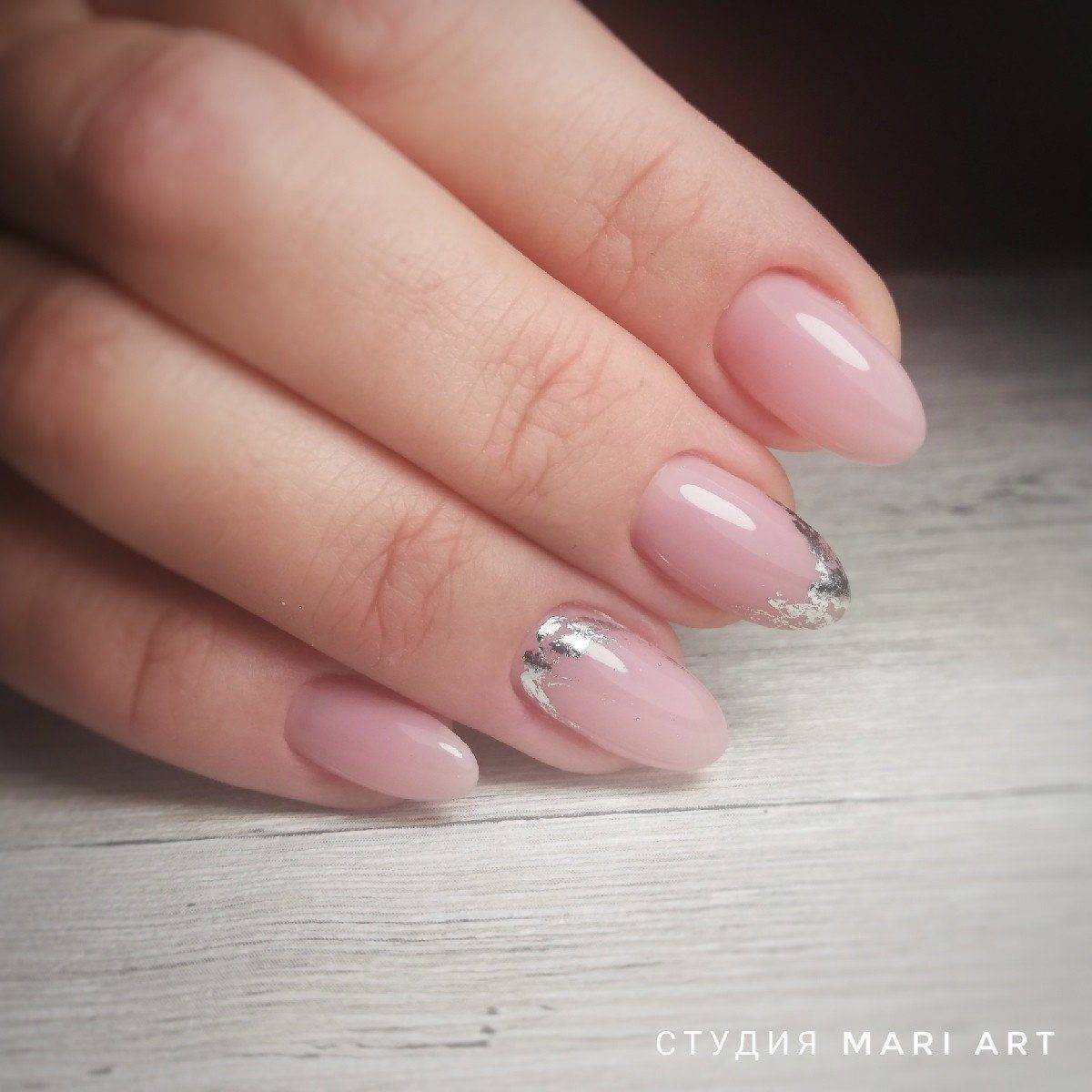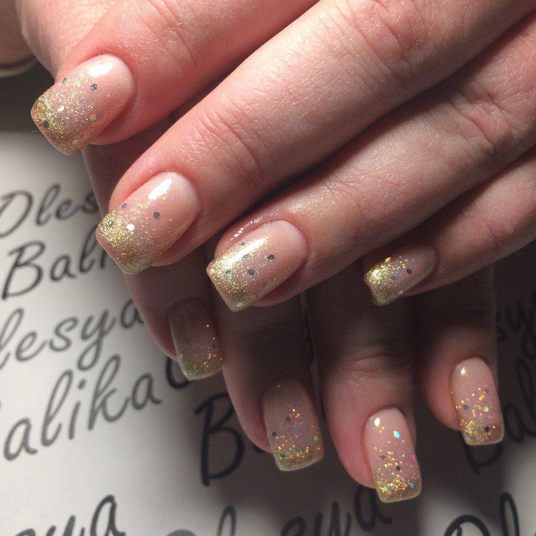 Чтобы связать блестящие и нюдовые ноготки – слегка задекорируй глиттером кончики. Получается сдержанный, но лаконичный праздничный маникюр на короткие ногти.