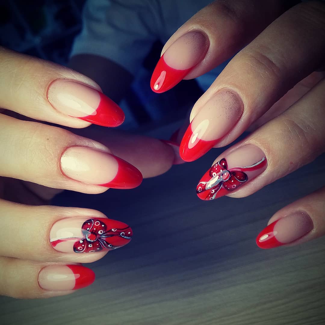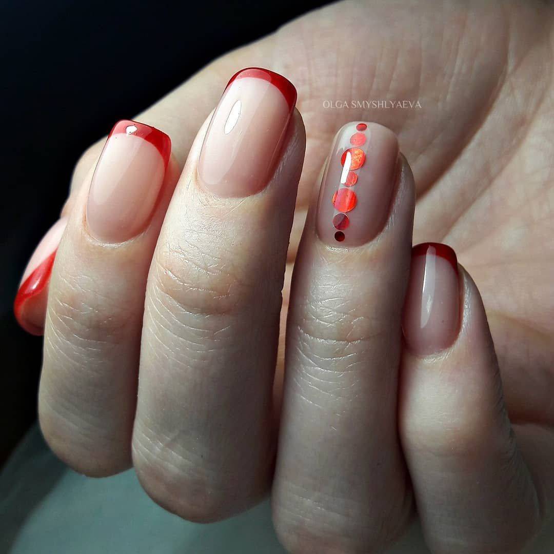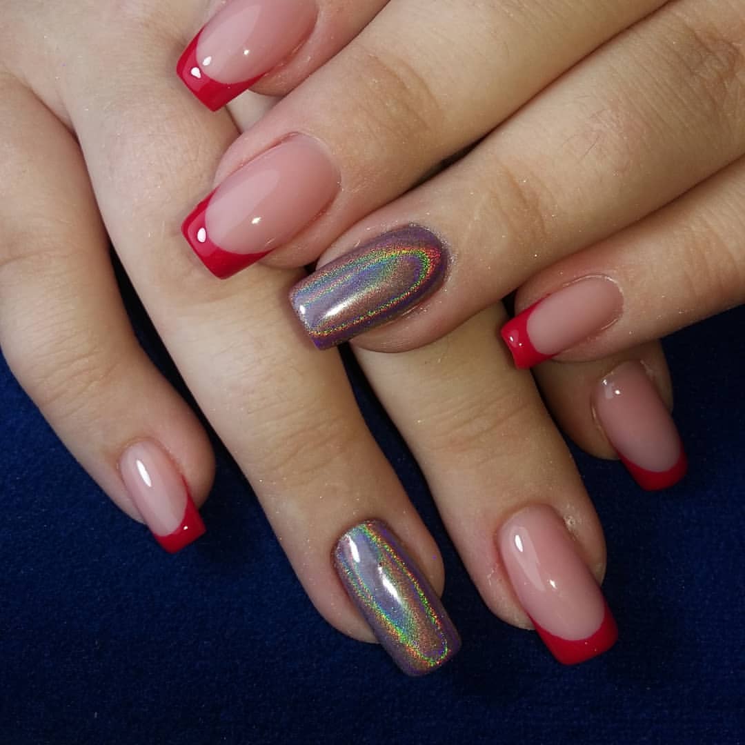 Мы уже упоминали о том, что блестки лучше всего гармонируют с классическими оттенками. О белом и черном френче мы знаем практически все. Где бы вы ни разместили их, ваш дизайн будет выглядеть ухоженно и стильно. Что касается красного или бордового френча, то тут есть несколько нюансов.