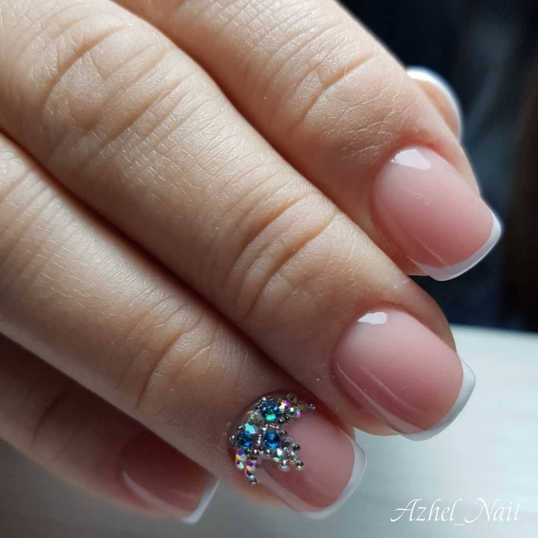 - комбинированный френч с блестками – имеется ввиду сочетание френча и лунного маникюра. Располагайте блестки в тех местах, где должна быть прорисовка края ногтевой пластины и лунки. Чередуйте гель-лак с блестками на разных ногтях, добавьте в дизайн стразы.