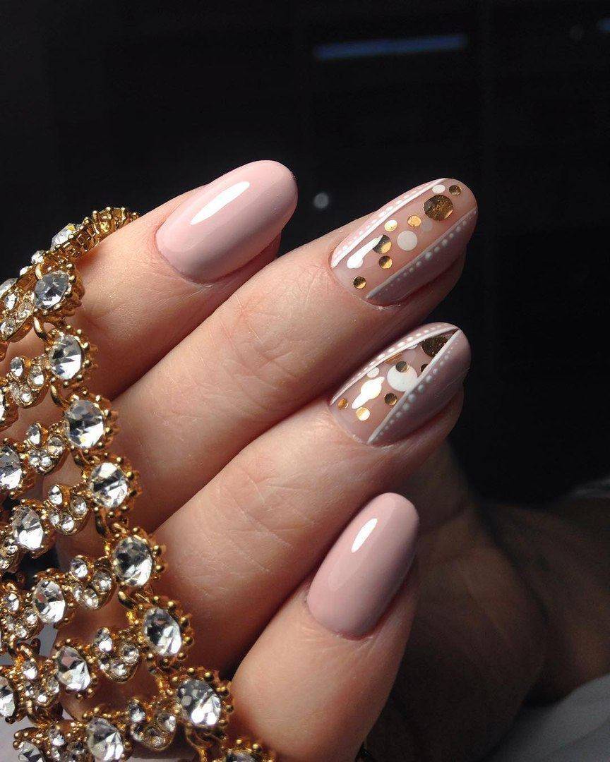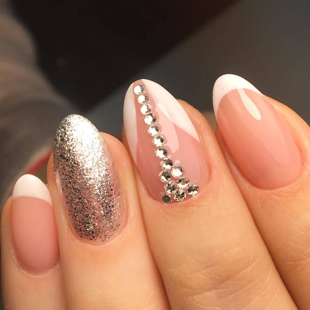 Спокойное сочетание нюда и белого играет по-новому, если один пальчик усыпать крупными блестками.