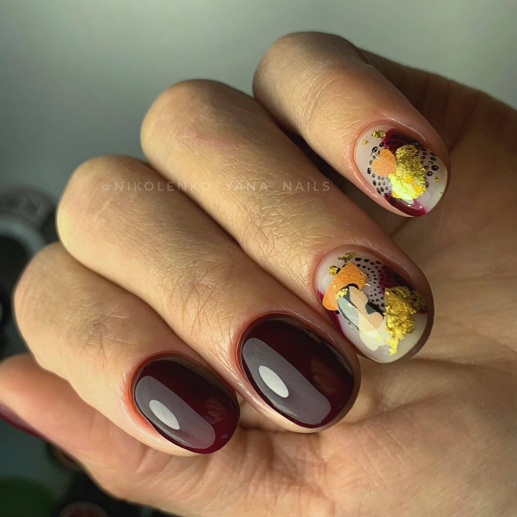 Золотистые акценты на ногтевых пластинах с бордовым лаком вызывают абсолютно противоположные чувства, если сравнивать с предыдущим предложением, ведь сияние золота – это всегда страсть и буря эмоций. Следовательно, подобное решение больше подходит барышням, предпочитающим тёплую гамму оттенков. Как и в случае с серебром, золотистые блёстки очень красиво смотрятся на кончике и у основания ногтевой пластины, могут украшать ноготок полностью или использоваться для нанесения узоров. В этом случае каких-то особых правил и техник не существует. Главное отличие – настроение, которое создаётся при помощи блестящих деталей и визуальное восприятие драгоценного сияния.