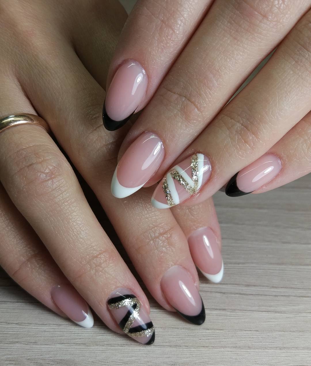 В черном цвете отлично смотрится геометрический декор. Глиттер используется для прорисовки отдельных зон на узоре, для сплошного покрытия ногтей. Присмотритесь к французскому маникюру с серебряным или золотым глиттером по краю ногтевой пластины. Визуально блестящая “улыбка” френча будет удлинять ноготки, делать маникюр эффектнее и благороднее.