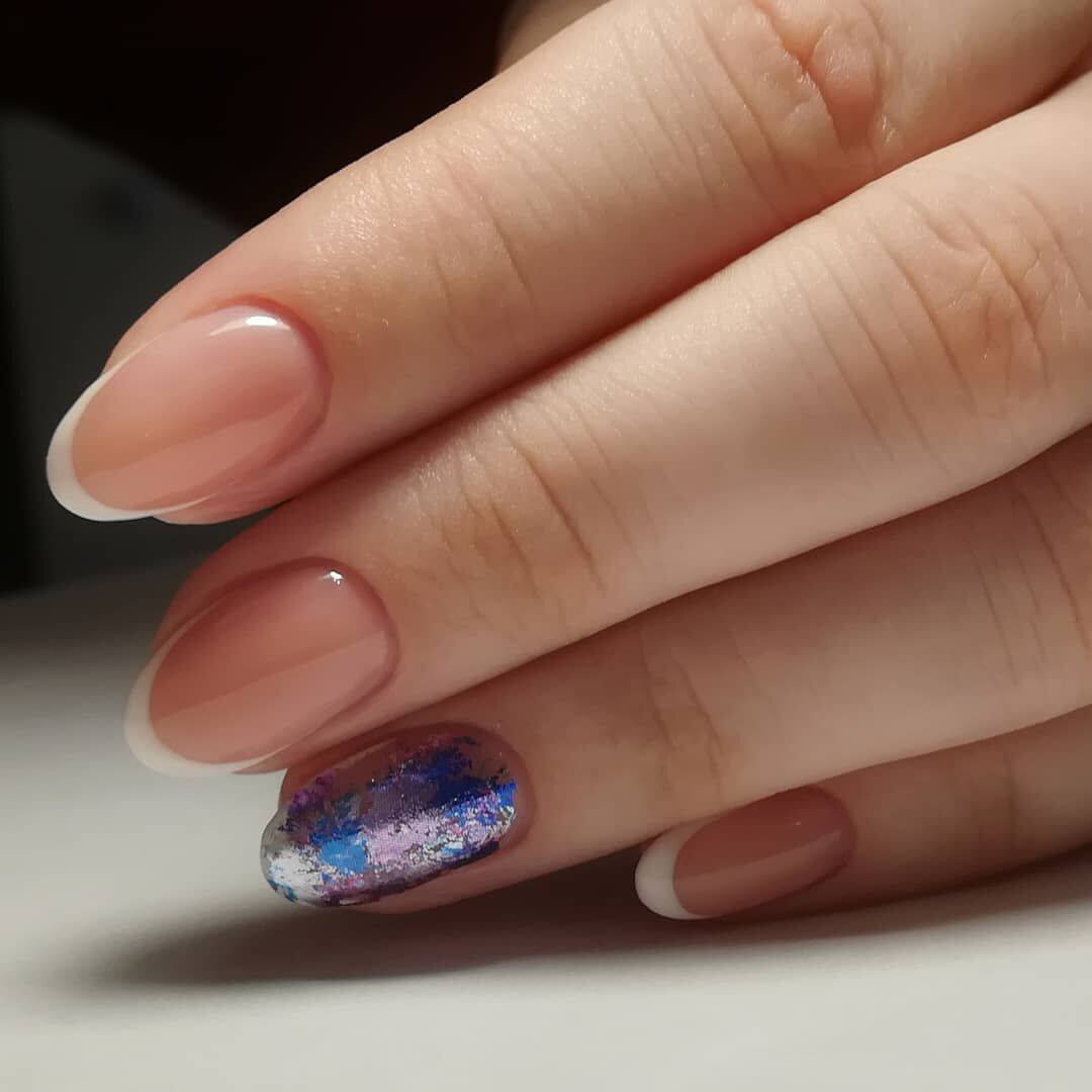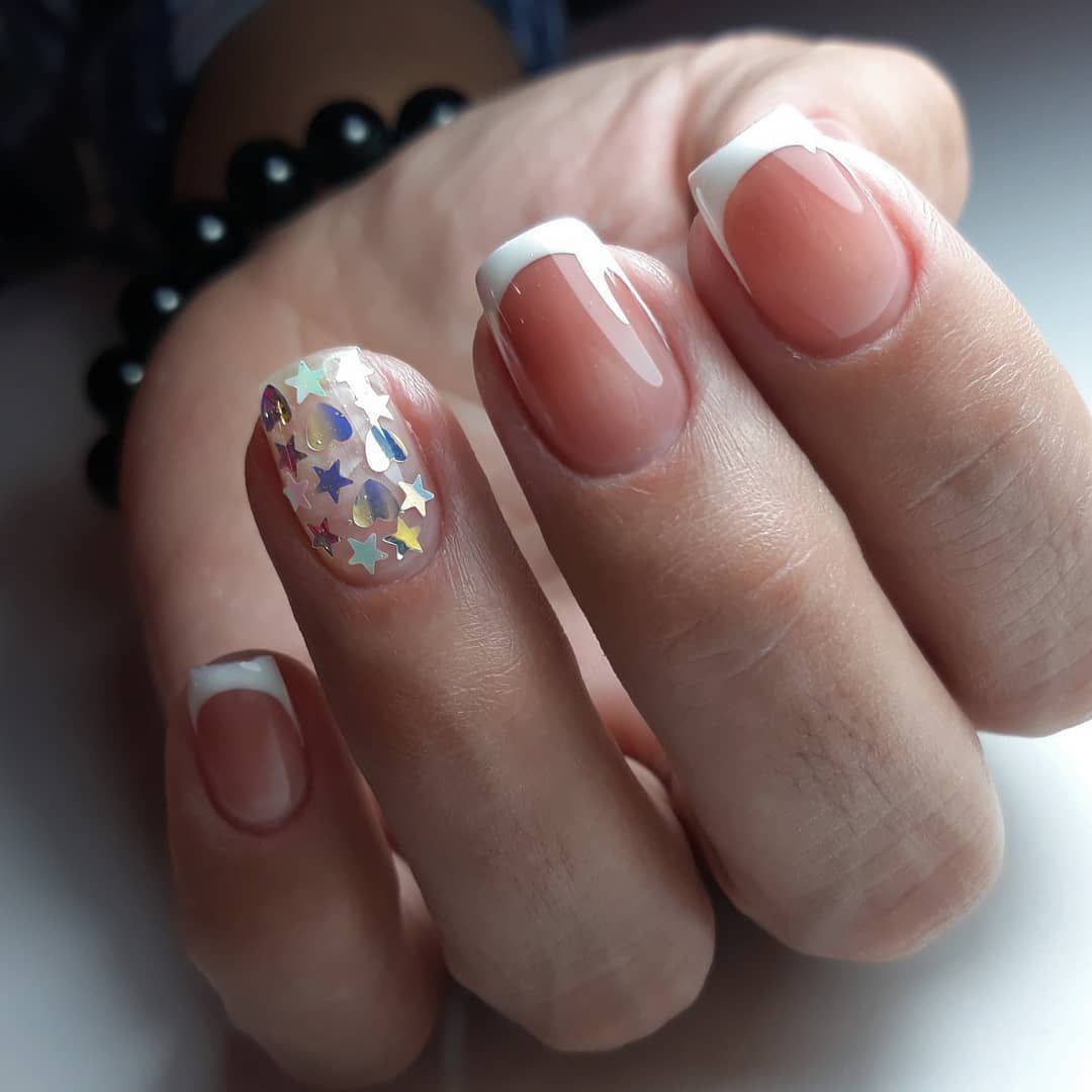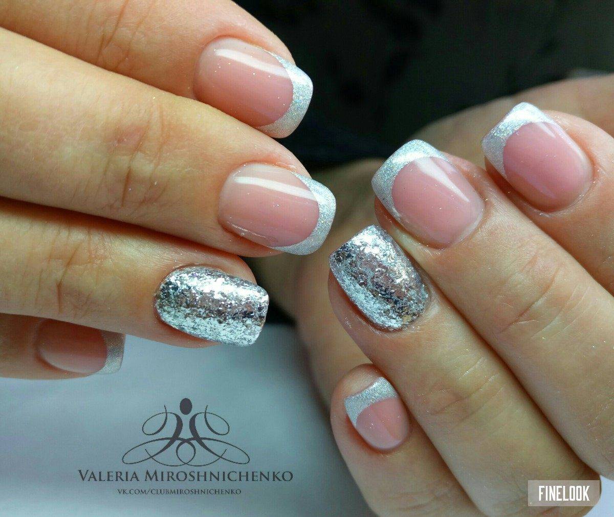 Некоторые нейл-мастера вообще не включают блестящий декор в французский дизайн, а выделяют для него один из ноготков на руке. На него наносится сплошной слой серебряного или золотого глиттера, мелланж с блестками, пайетки.