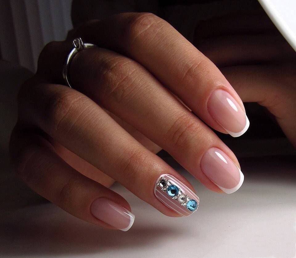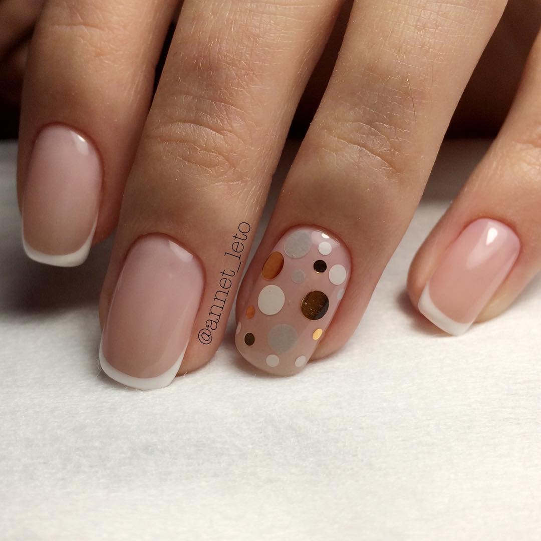 Короткие ноготки в таком случае можно оформить блестящей втиркой или специальным песком. Такой дизайн смотрится очень натурально и привлекательно. Кроме этого, он является универсальным и подойдет под любой наряд.