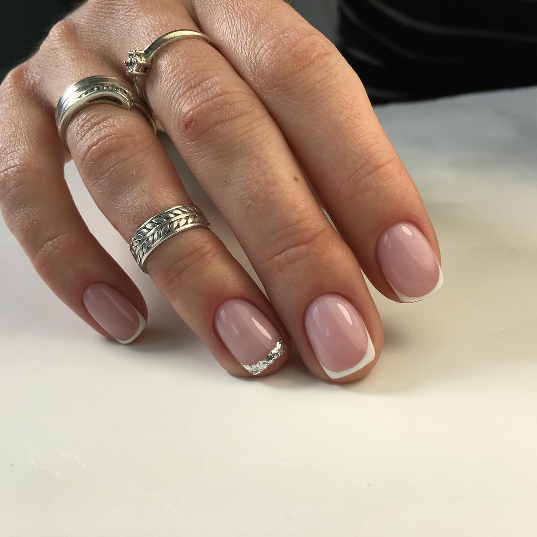 Как вы уже догадались, речь здесь пойдет о лунном маникюре. Это идеальный вариант для ежедневной носки. Зона улыбки может быть оформлена золотыми или серебряными блестками.
