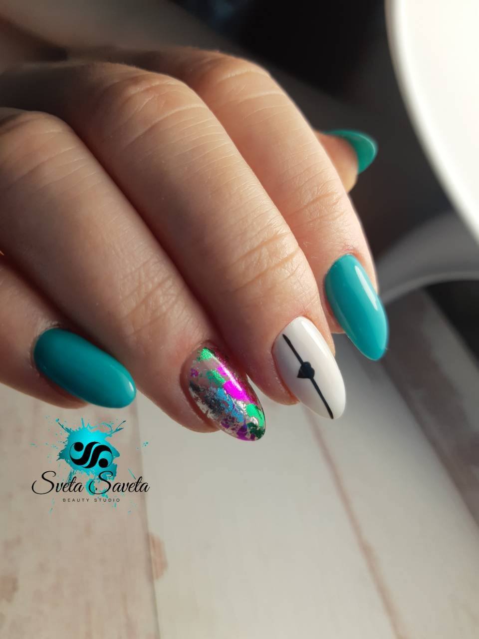 Маникюр с фольгой. Покройте ноготки натуральным или пастельными оттенком лака, а поверх липкого слоя прикрепите кусочки металлизированного листа или слюды, затем нанесите на ногти финишное покрытие – это самый простой способ оформления блестящего маникюра для коротких ногтей.