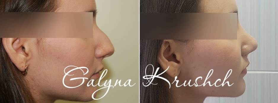 Посмотрите фото до и после ринопластики носа. Нос выглядит замечательно, никакой горбинки больше нет, швов тоже не видно. Пациентка очень довольна.